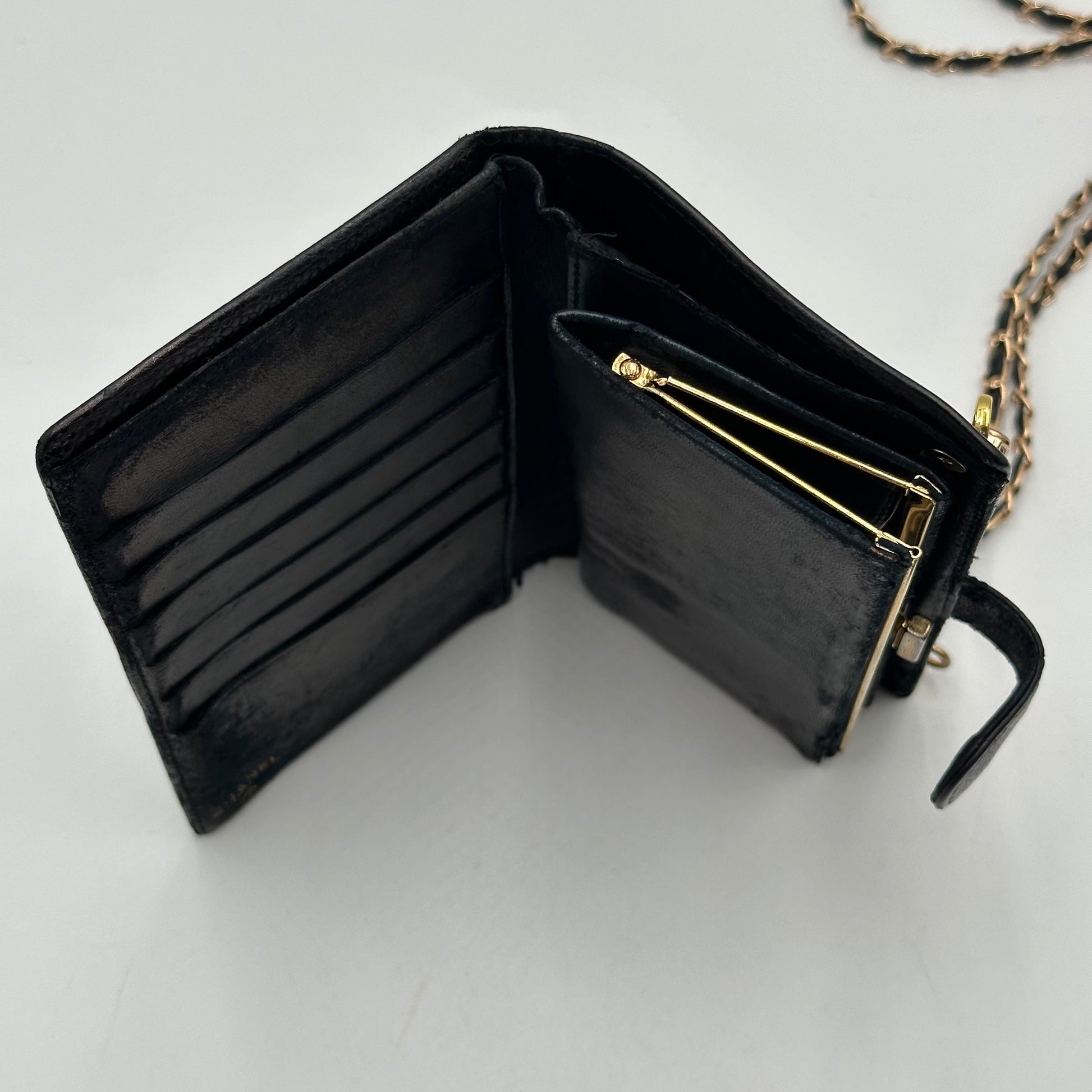 Approx. 7.5 in x 4 in vintage black wallet that comes with a non branded crossbody chain attach by 2 installed rings on the back. Serial code is on the inside pocket corner reading 6065491. This beautiful wallet originally retails for