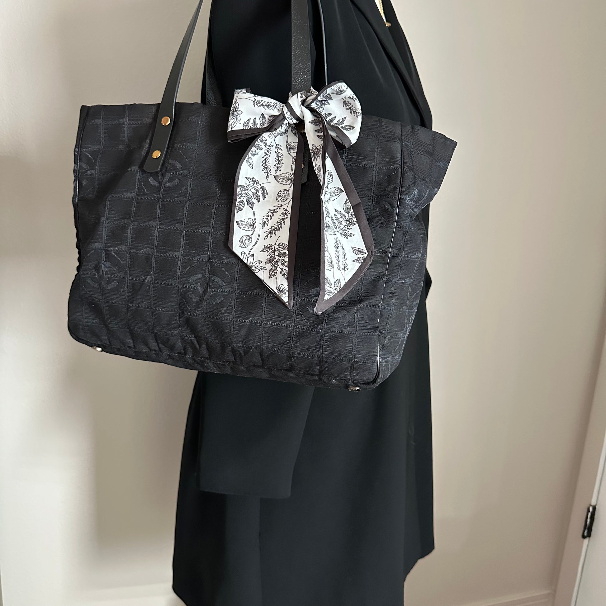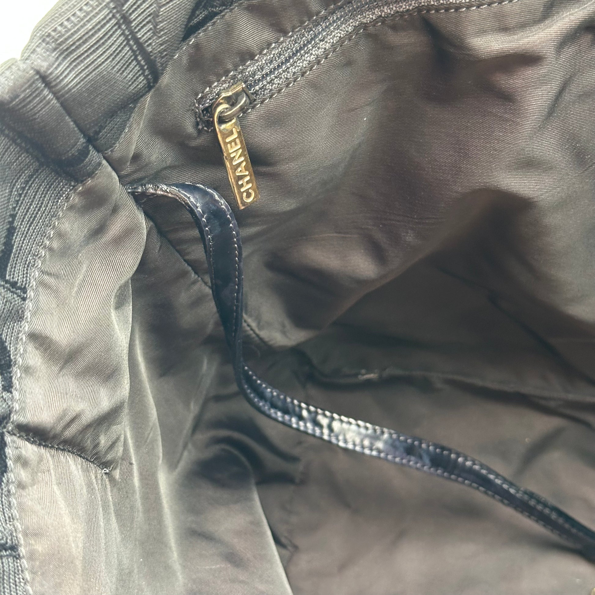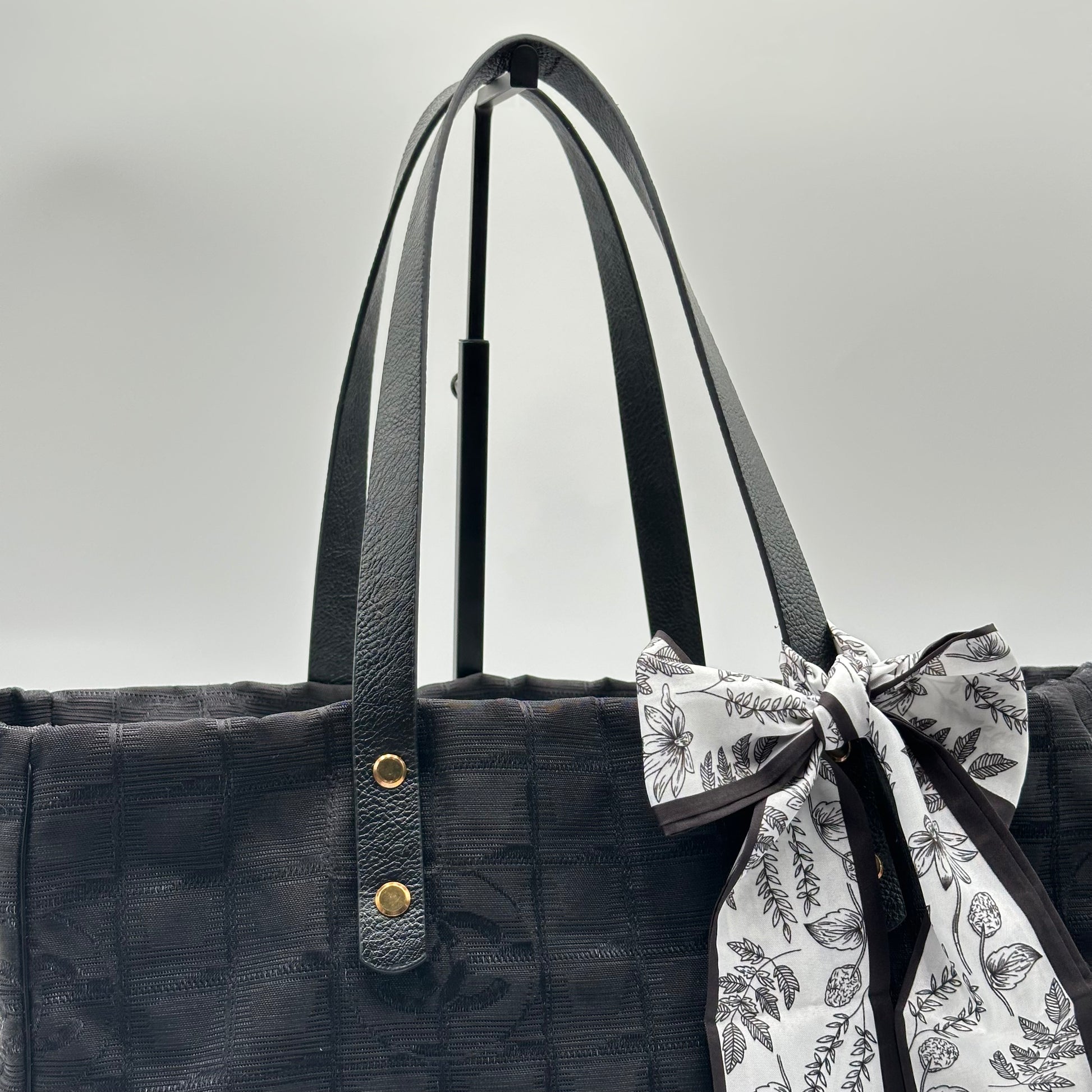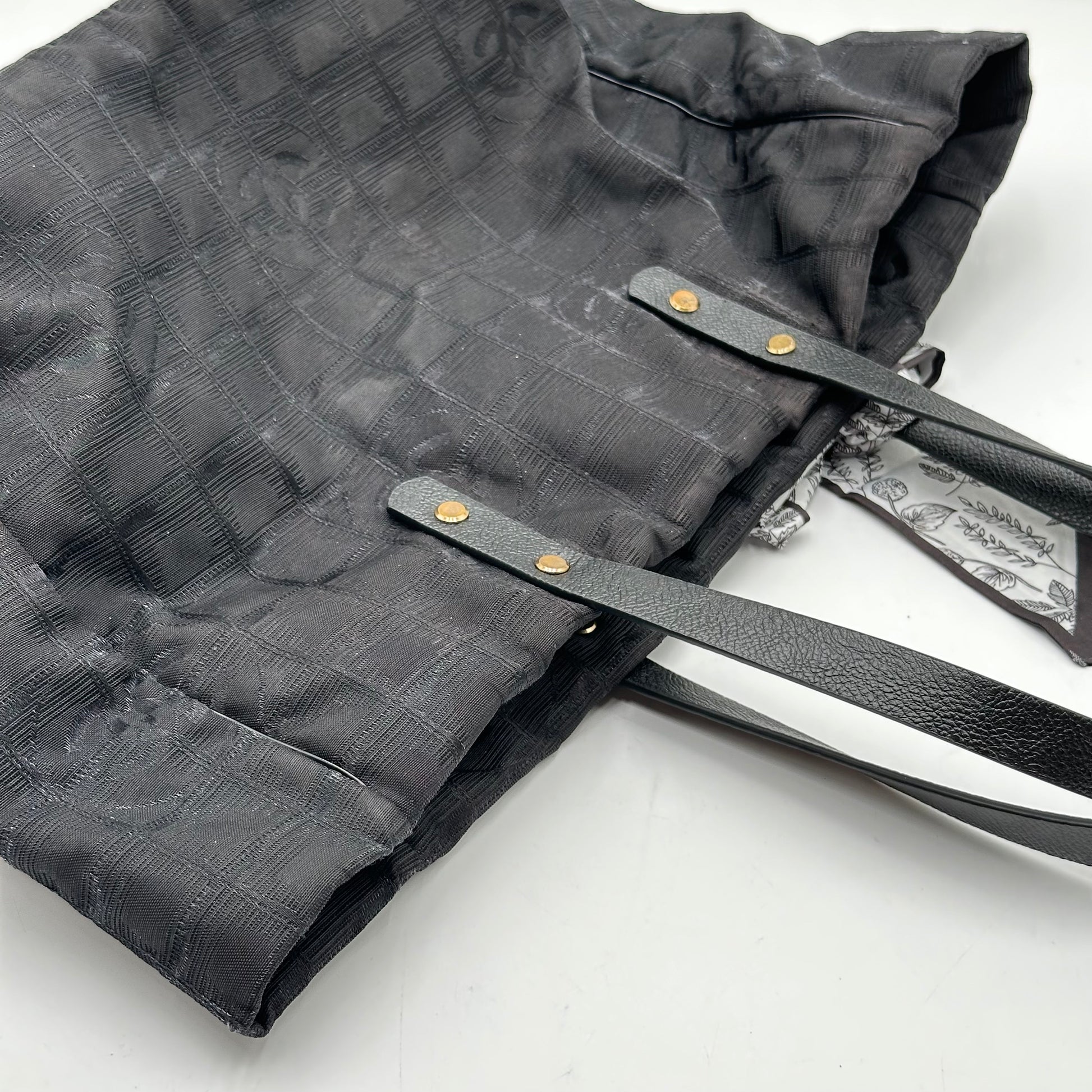 This black Chanel Medium Travel Line tote is a chic and functional vintage piece, originally released in the early 2000s. Approximately measures 13.5 x 10. It has been professionally dyed and sealed in black; the original color was yellow, which remains beautifully vibrant on the interior. The tote features a spacious interior with no major signs of wear, and the original canvas and lining are free from tears. The original handles are in great condition, offering durability and comfort. Please note, the original straps were broken and have been replaced.
