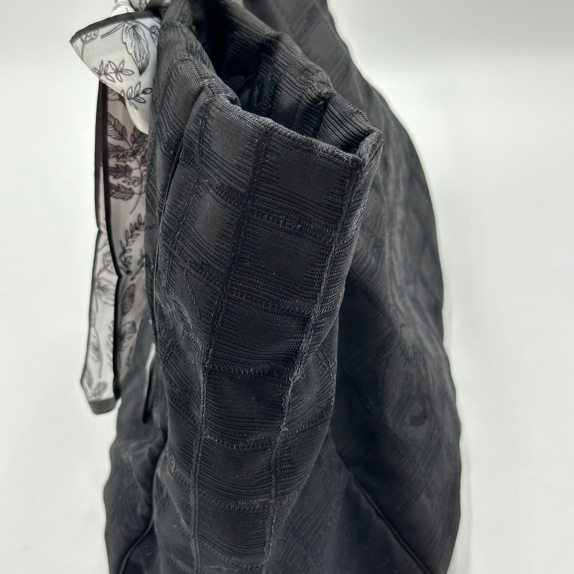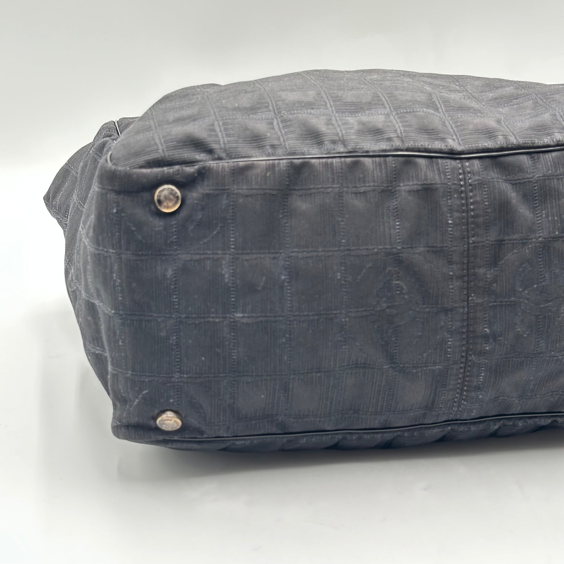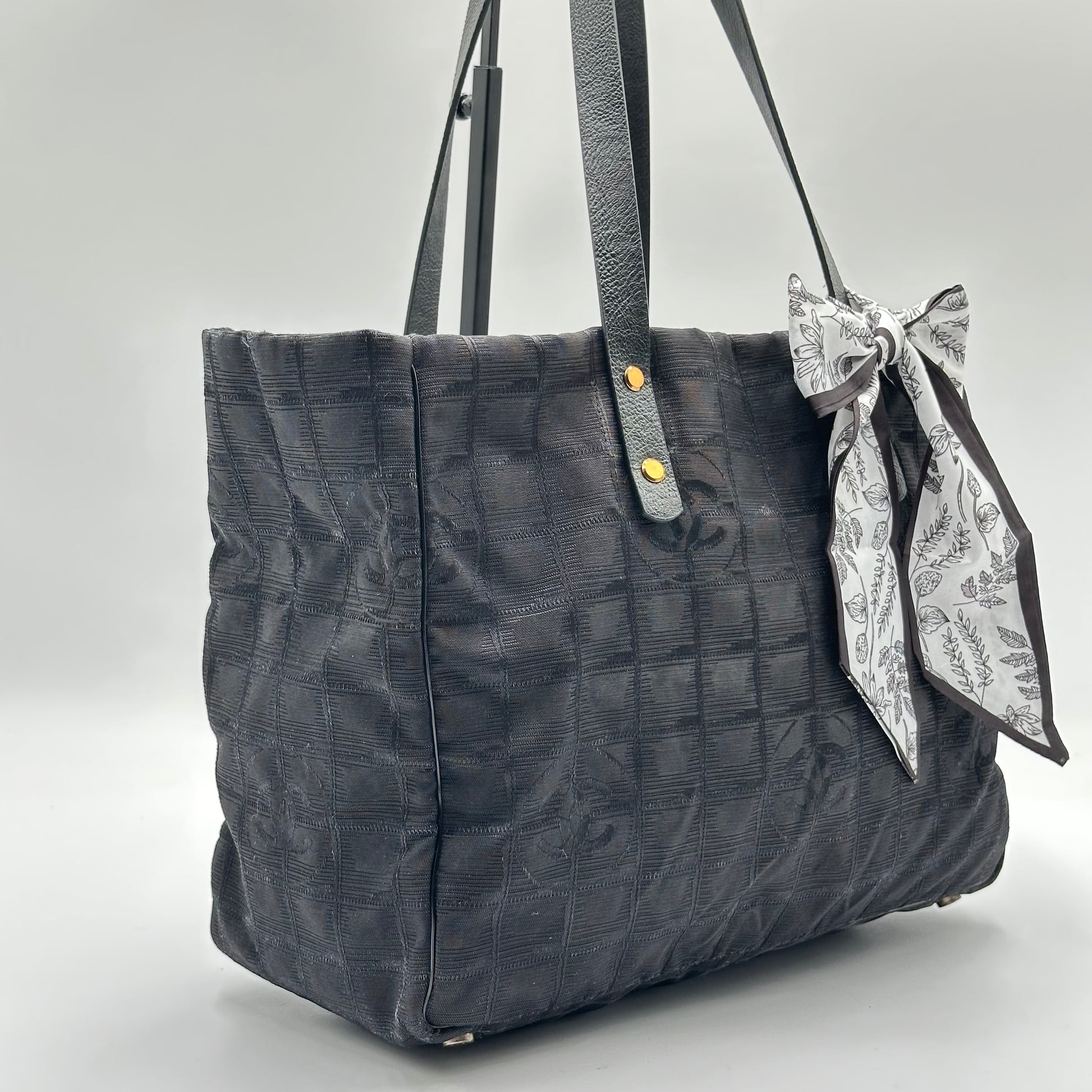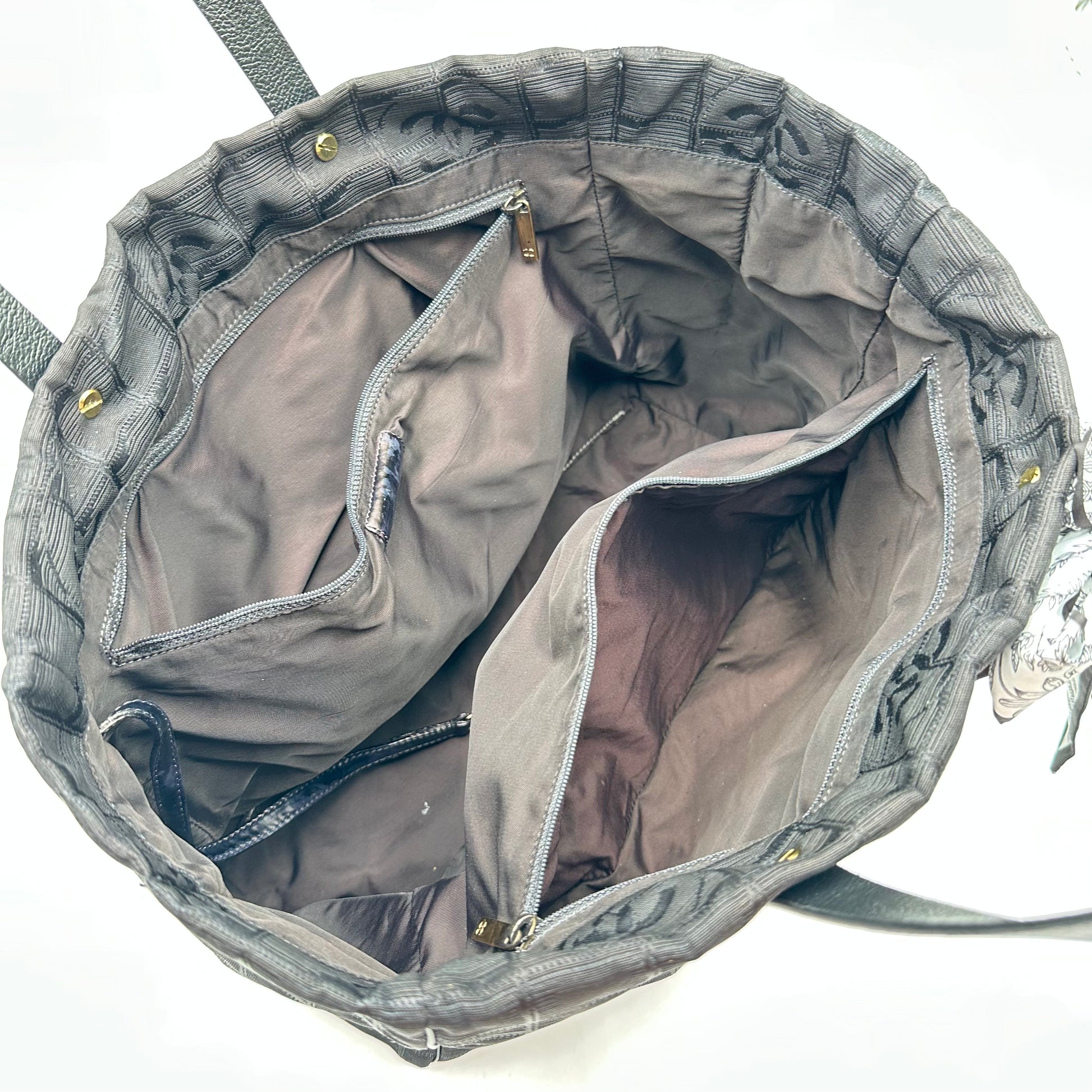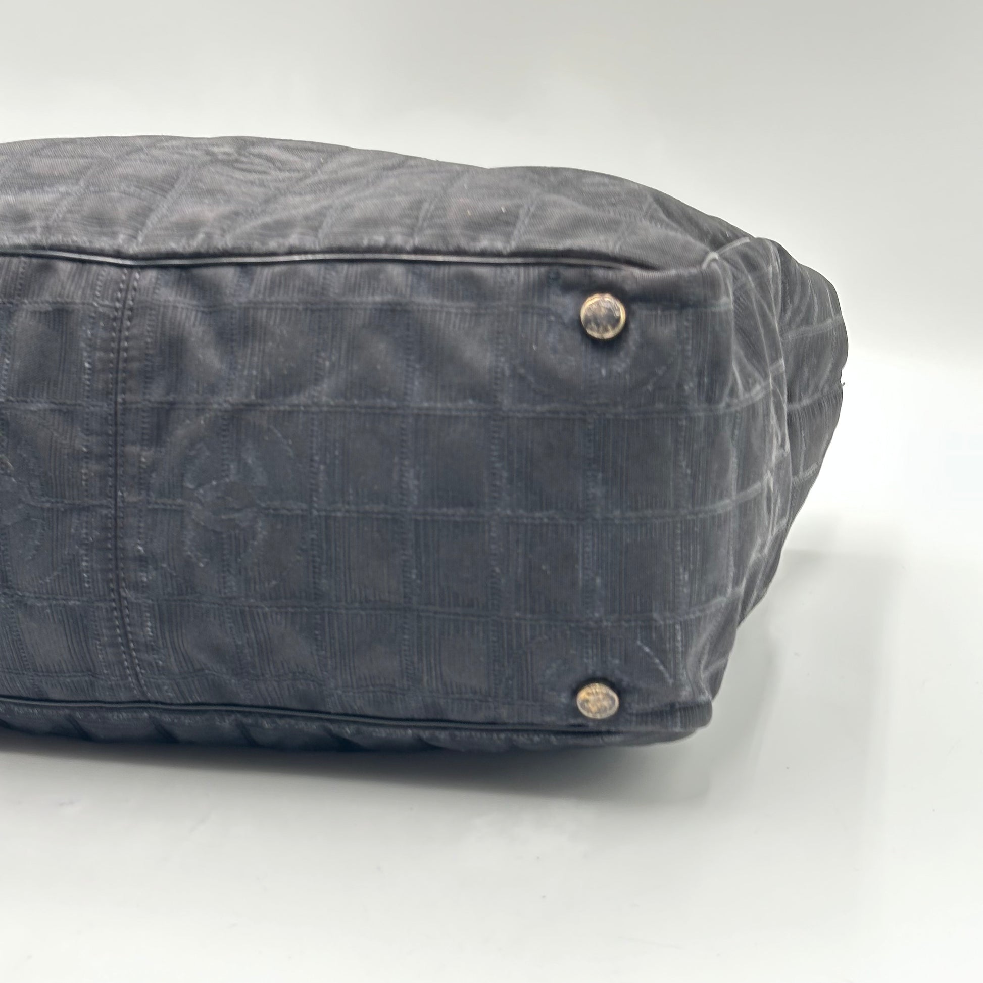 This black Chanel Medium Travel Line tote is a chic and functional vintage piece, originally released in the early 2000s. Approximately measures 13.5 x 10. It has been professionally dyed and sealed in black; the original color was yellow, which remains beautifully vibrant on the interior. The tote features a spacious interior with no major signs of wear, and the original canvas and lining are free from tears. The original handles are in great condition, offering durability and comfort. Please note, the original straps were broken and have been replaced.