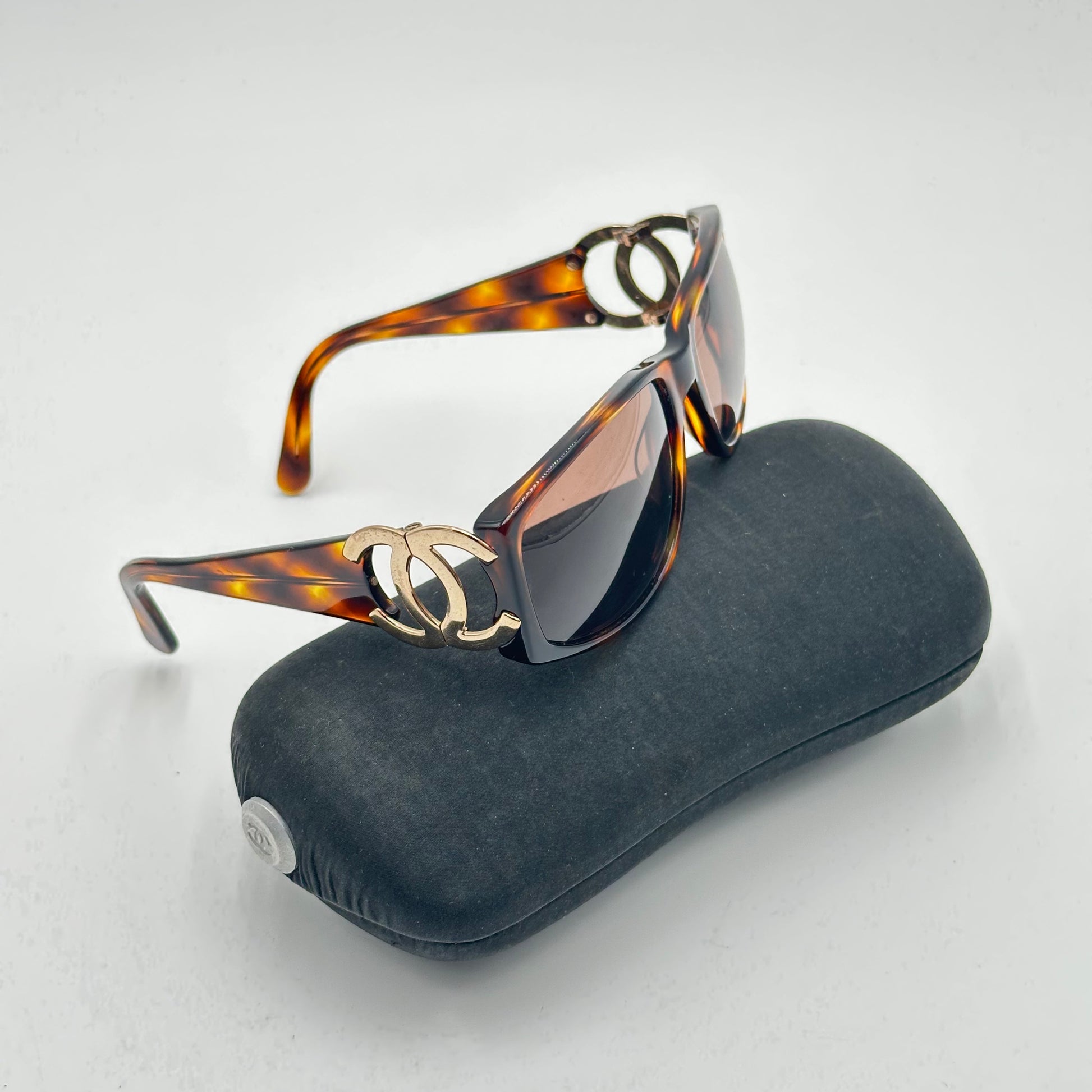 Super stylish brown tortoise shell 90's classic sunglasses. Features two gold tone CC emblems on each side. These plastic sunglasses are in great condition showing some use. They do include their carrying case. No major damage or scratches on the lens or sides. Please review all photos carefully, not new and priced according to condition