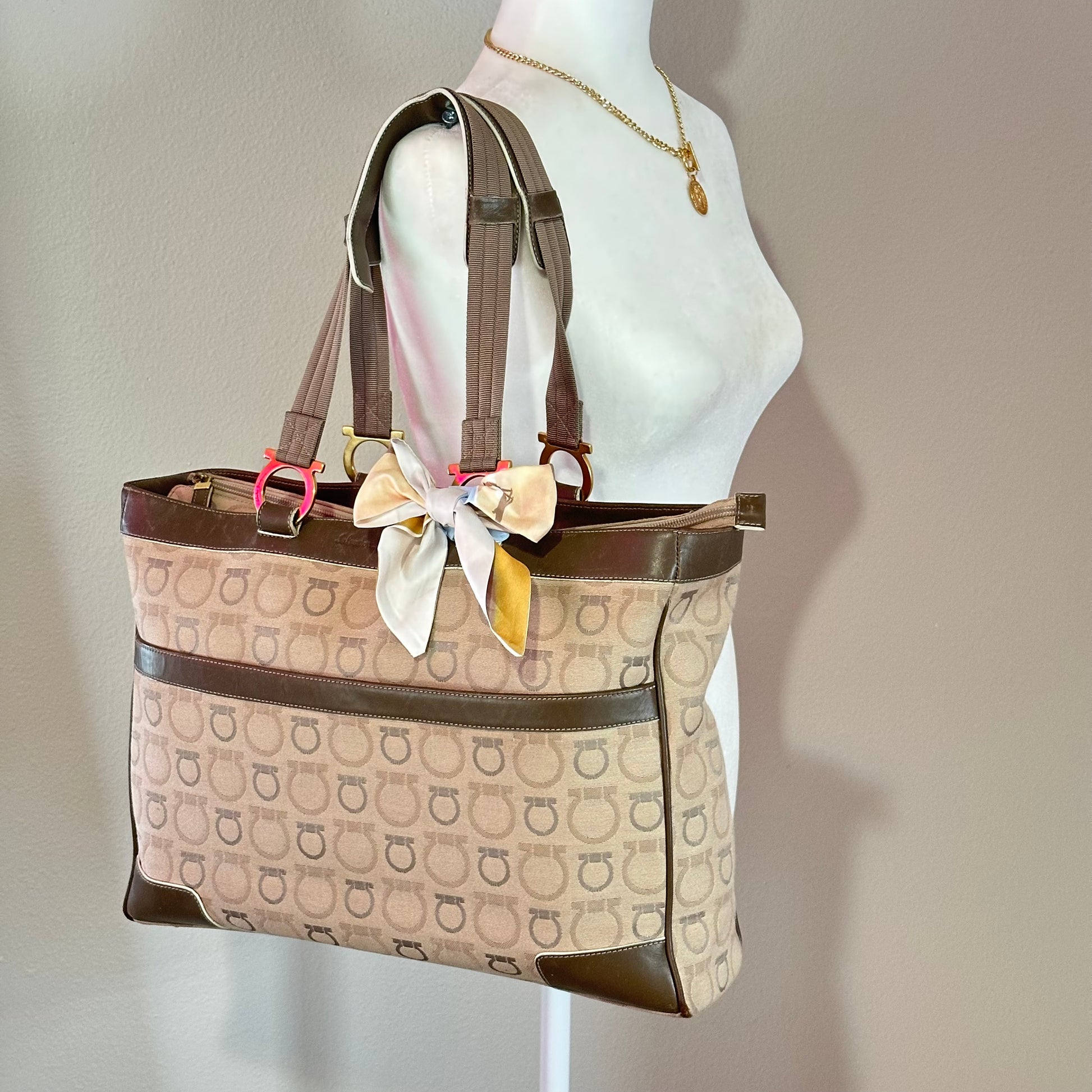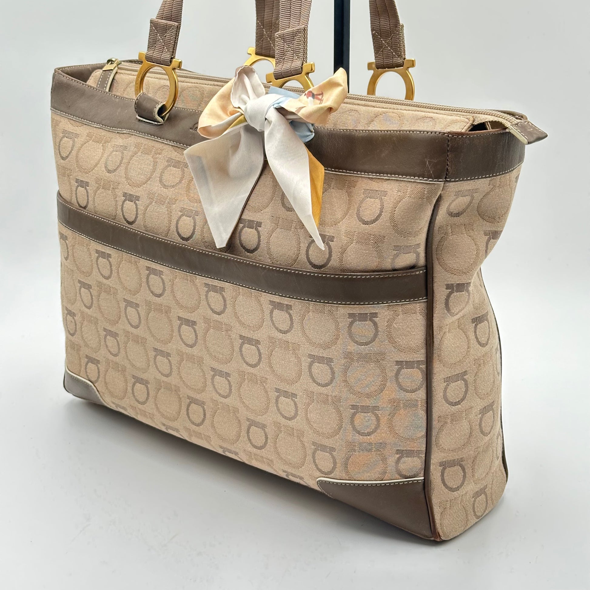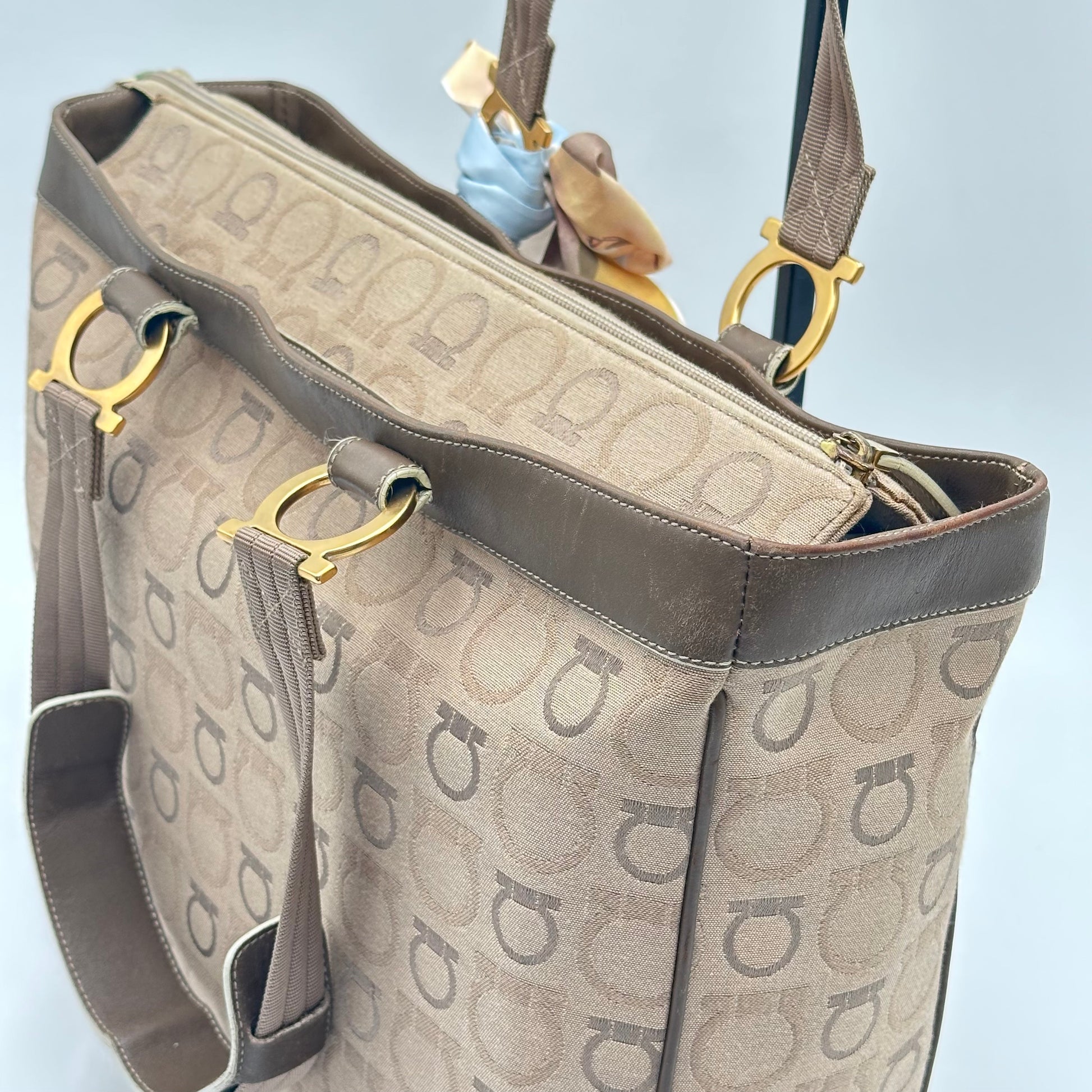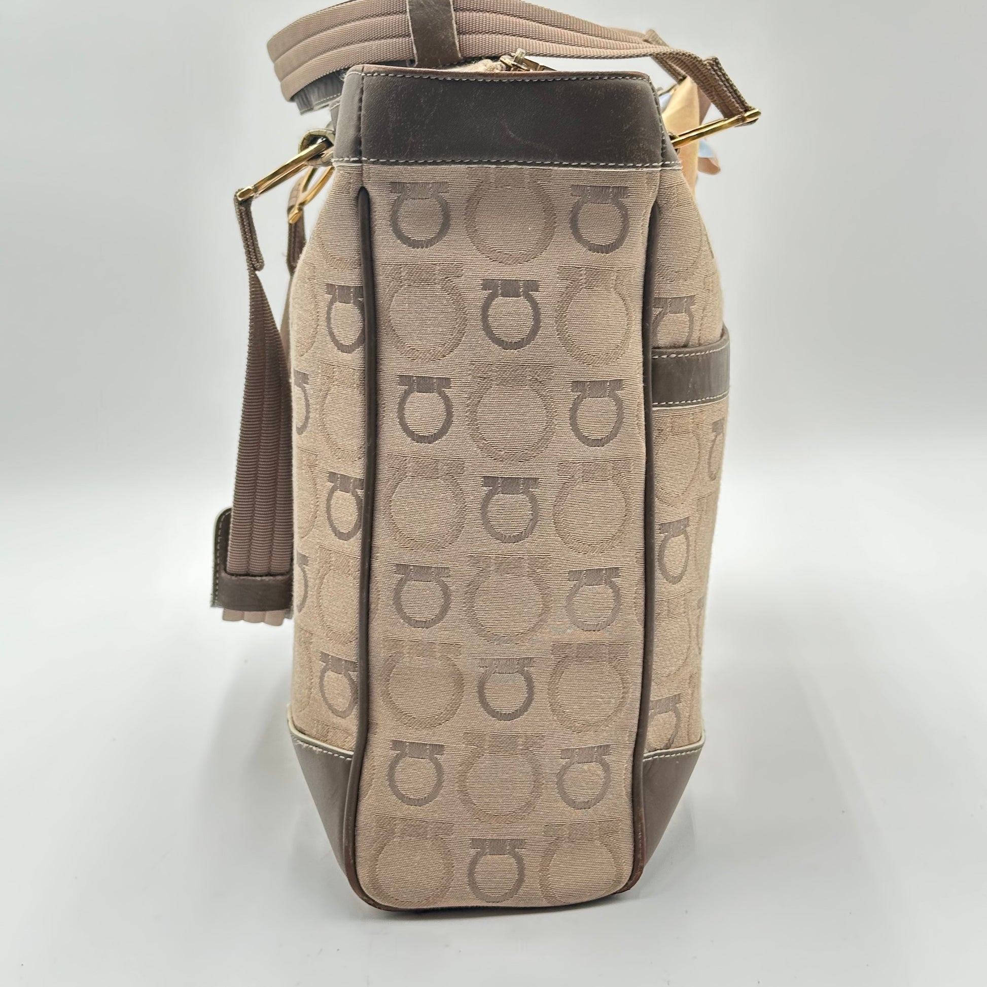 Authentic Salvatore Ferragamo Gancini Large Tote in a rich light brown canvas with leather trim, available for $350. Financing is available on my website. This elegant and functional piece is crafted in Italy and features Ferragamo’s iconic gold-tone Gancini hardware, structured leather detailing, and a spacious interior perfect for work, school, or travel. It comfortably fits a laptop, folders, books, and more.