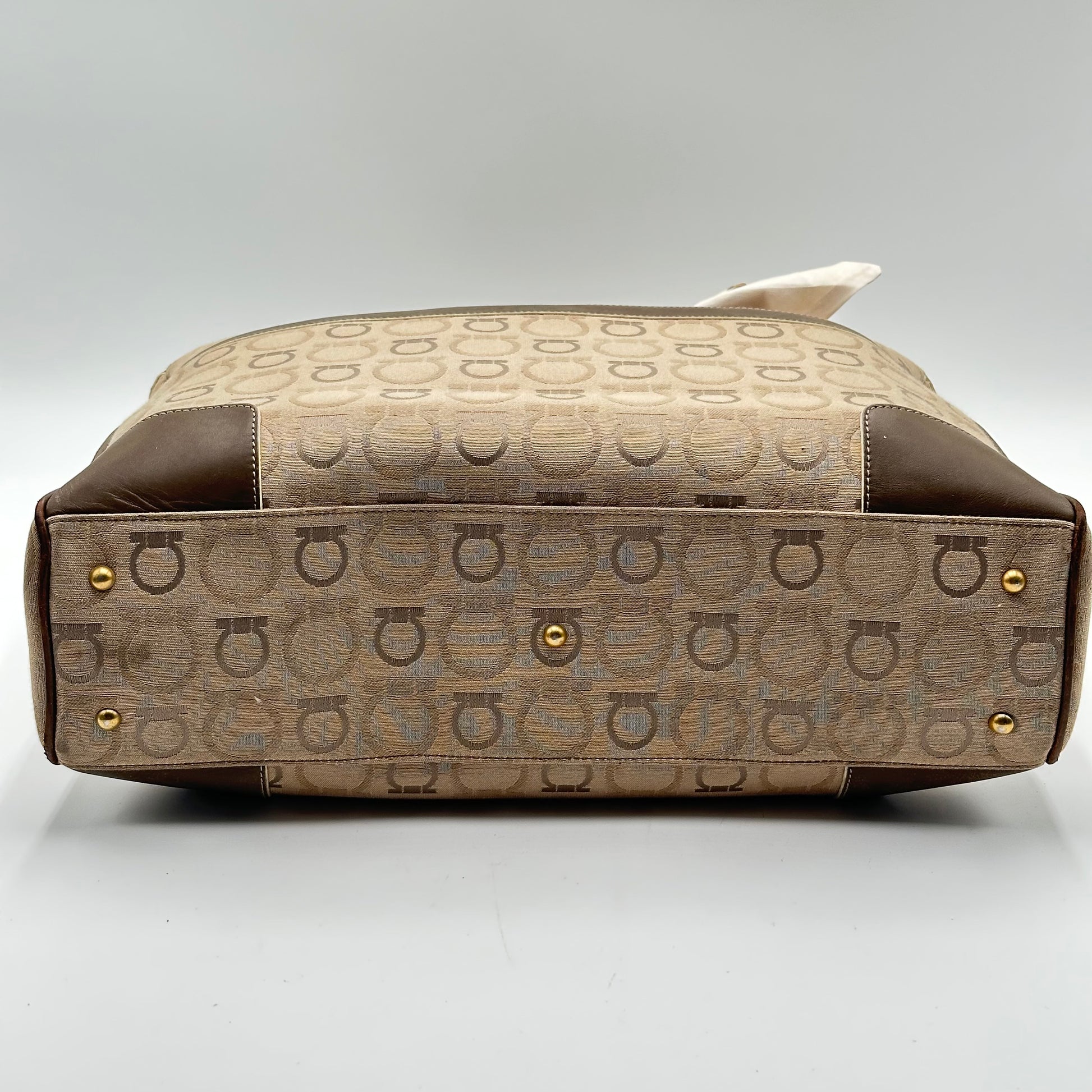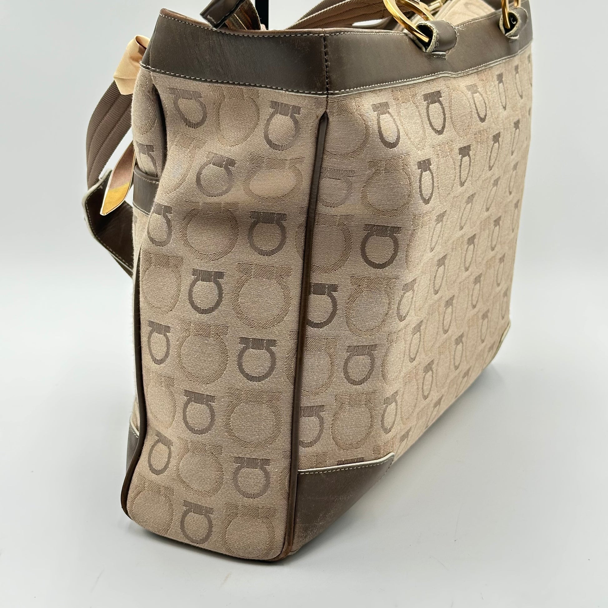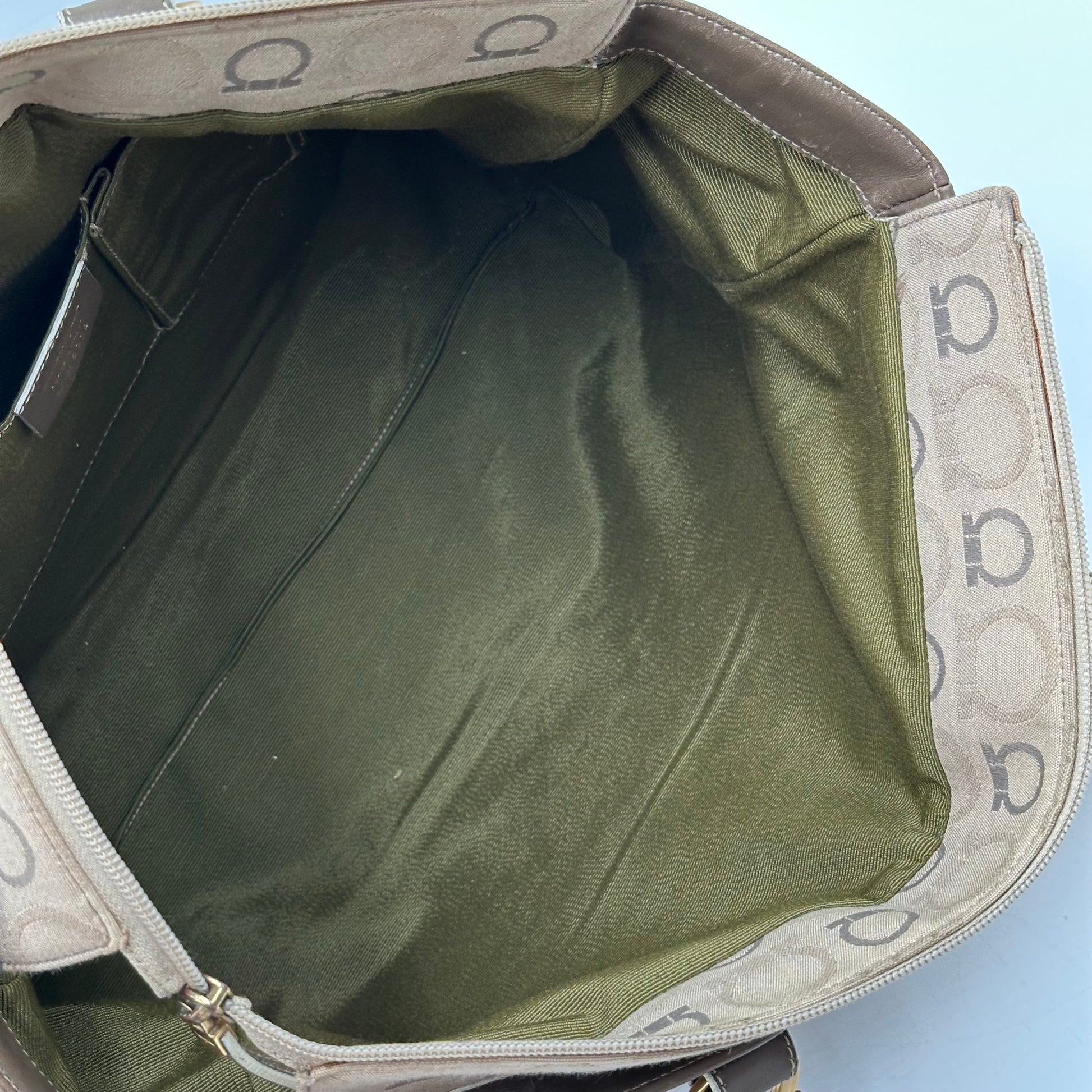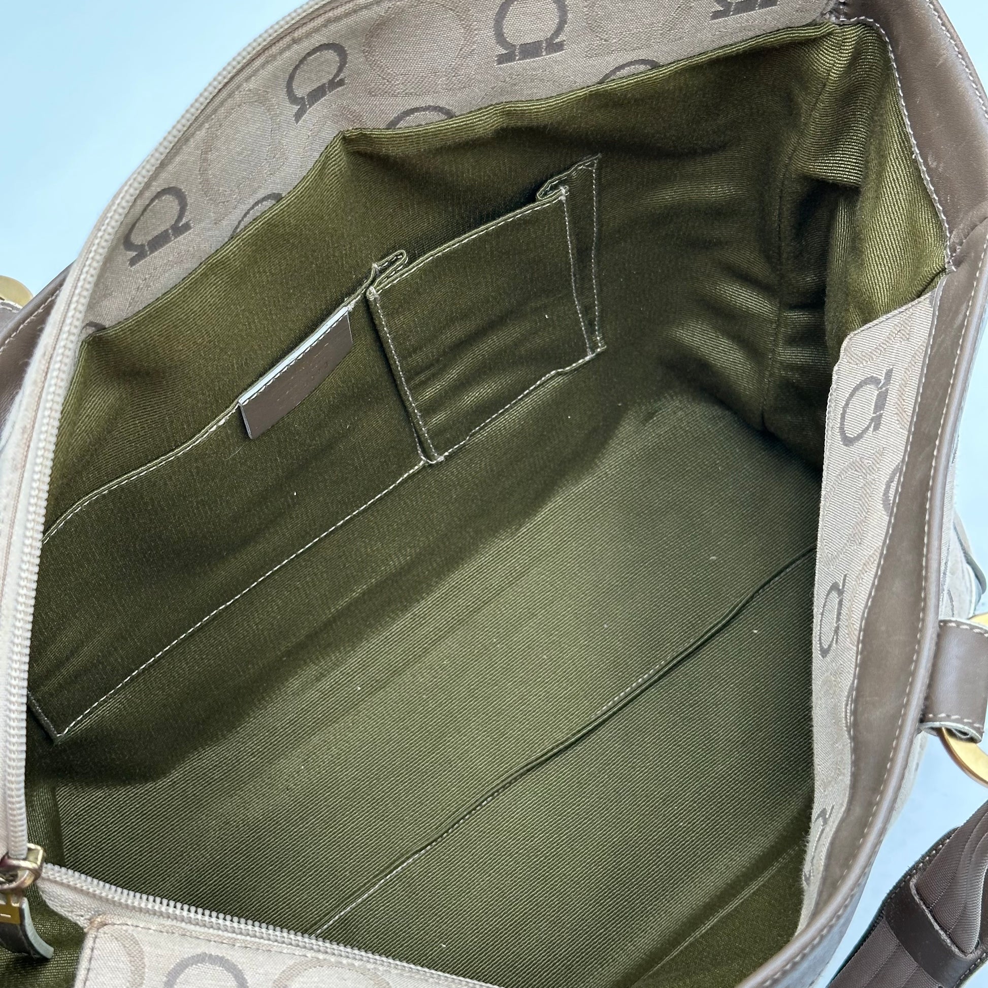 Authentic Salvatore Ferragamo Gancini Large Tote in a rich light brown canvas with leather trim, available for $350. Financing is available on my website. This elegant and functional piece is crafted in Italy and features Ferragamo’s iconic gold-tone Gancini hardware, structured leather detailing, and a spacious interior perfect for work, school, or travel. It comfortably fits a laptop, folders, books, and more.
