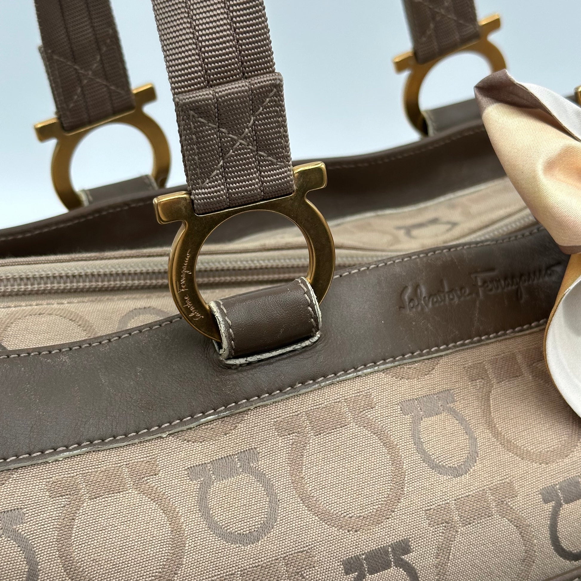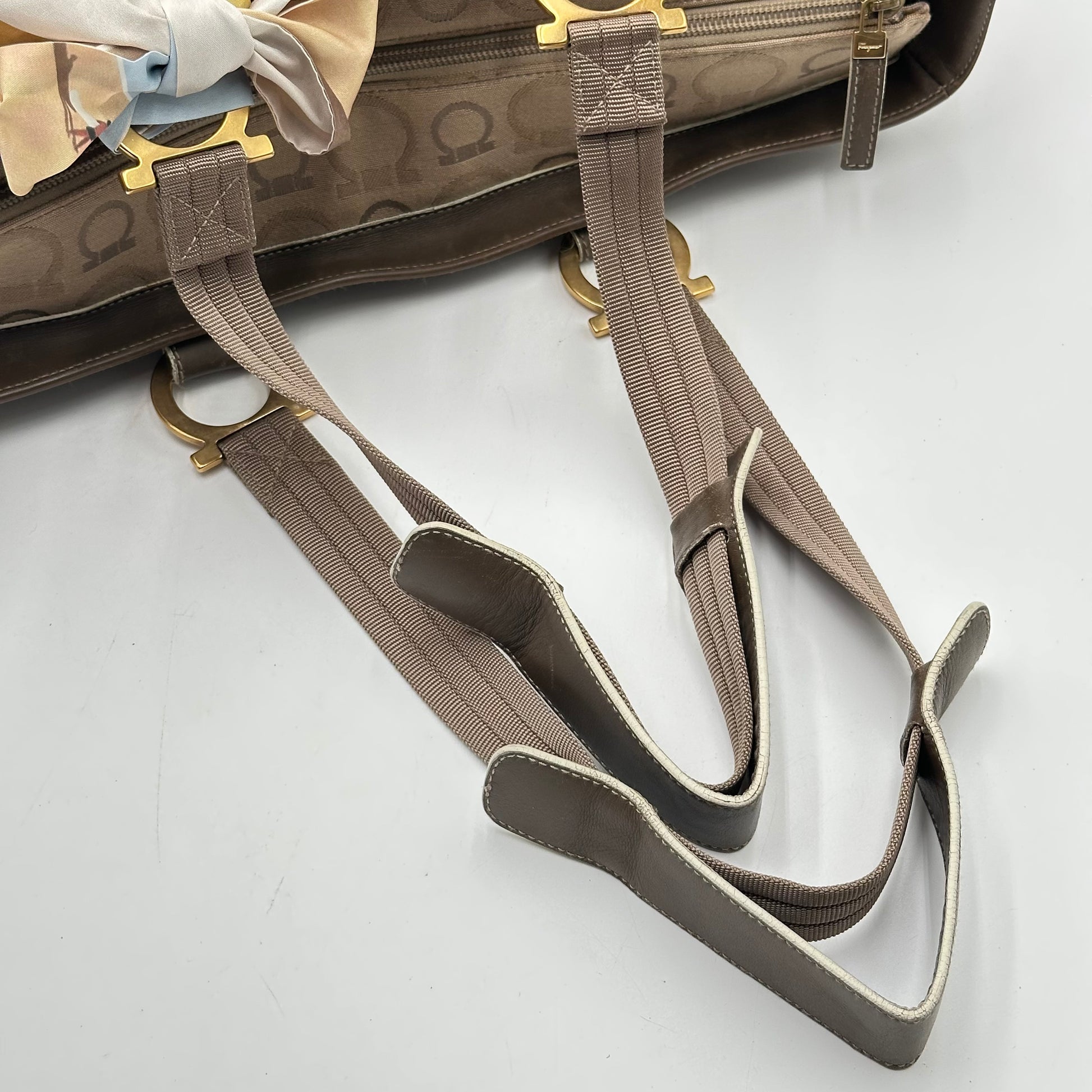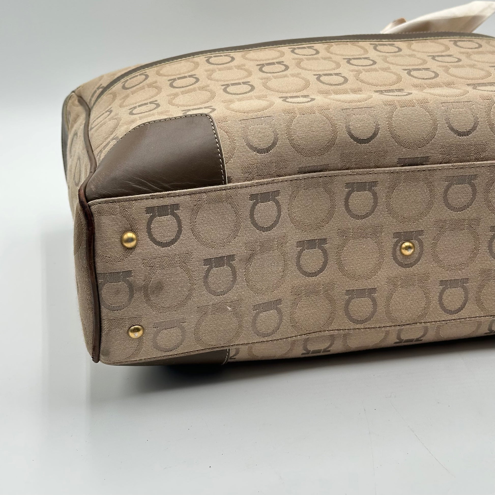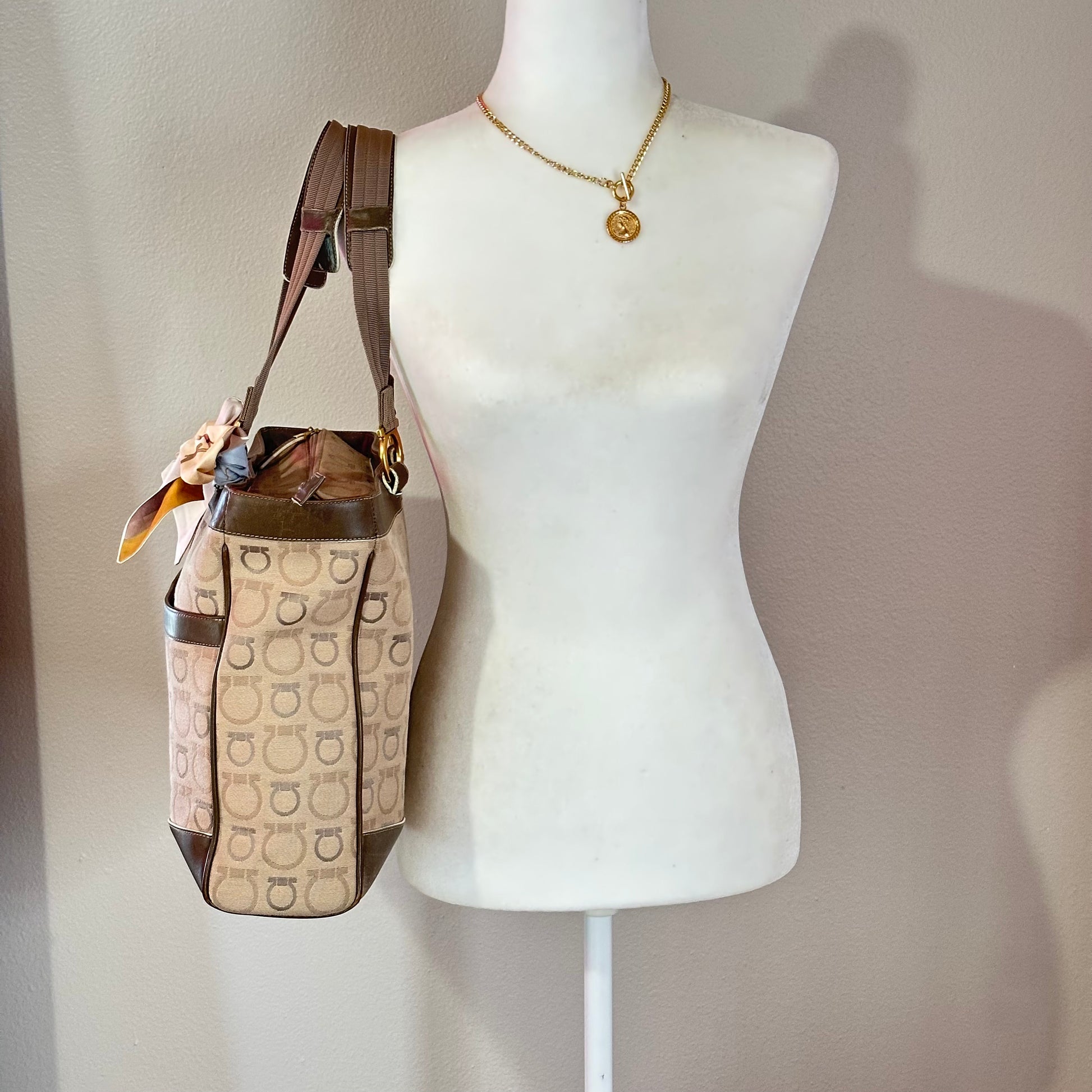 Authentic Salvatore Ferragamo Gancini Large Tote in a rich light brown canvas with leather trim, available for $350. Financing is available on my website. This elegant and functional piece is crafted in Italy and features Ferragamo’s iconic gold-tone Gancini hardware, structured leather detailing, and a spacious interior perfect for work, school, or travel. It comfortably fits a laptop, folders, books, and more.