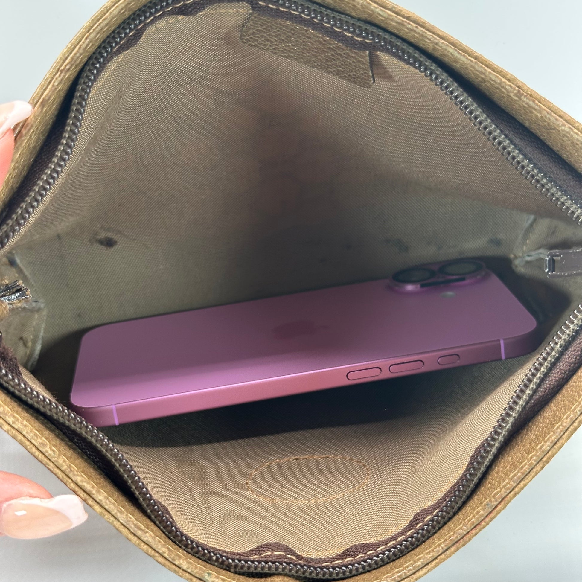 Two discreet gold rings have been added to the back, giving you the option to wear it hands-free with the included non-branded thick heavy duty guitar strap. It styles beautifully as a crossbody and comfortably fits a large iPhone Pro Max — perfect for on-the-go chic.