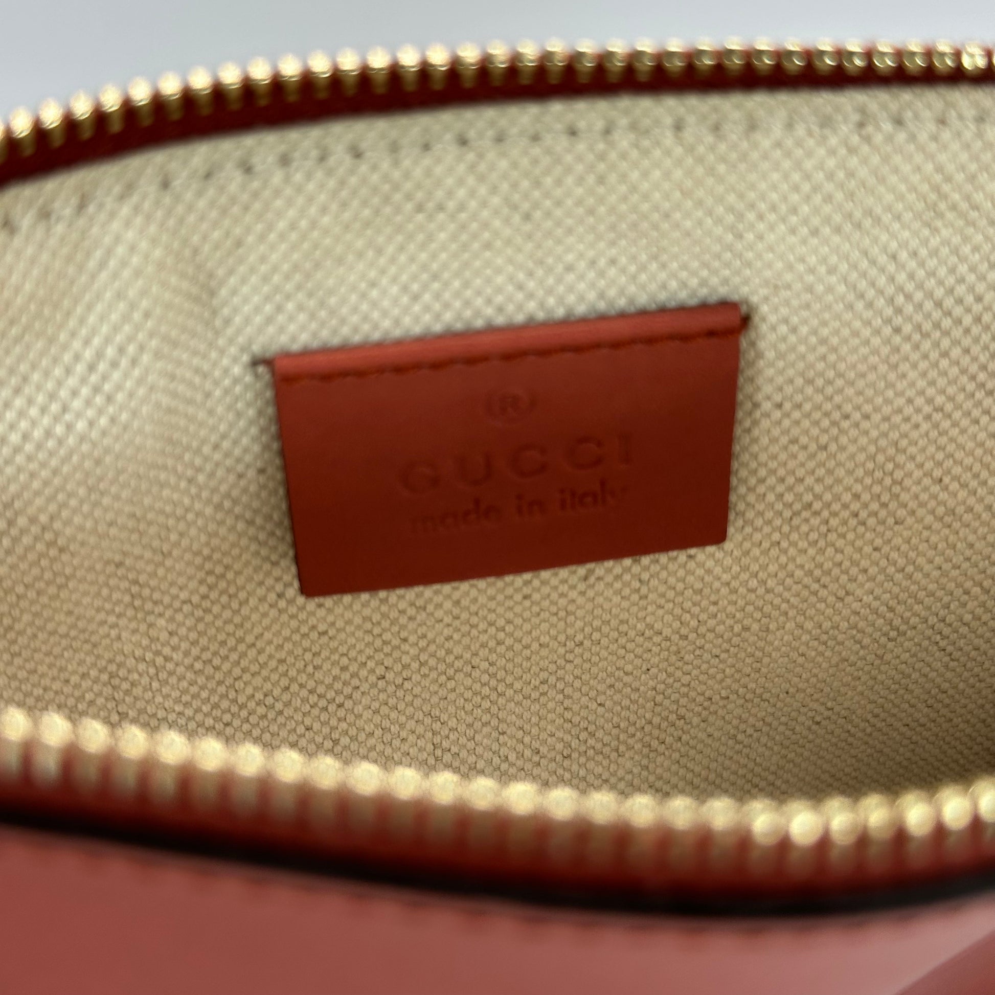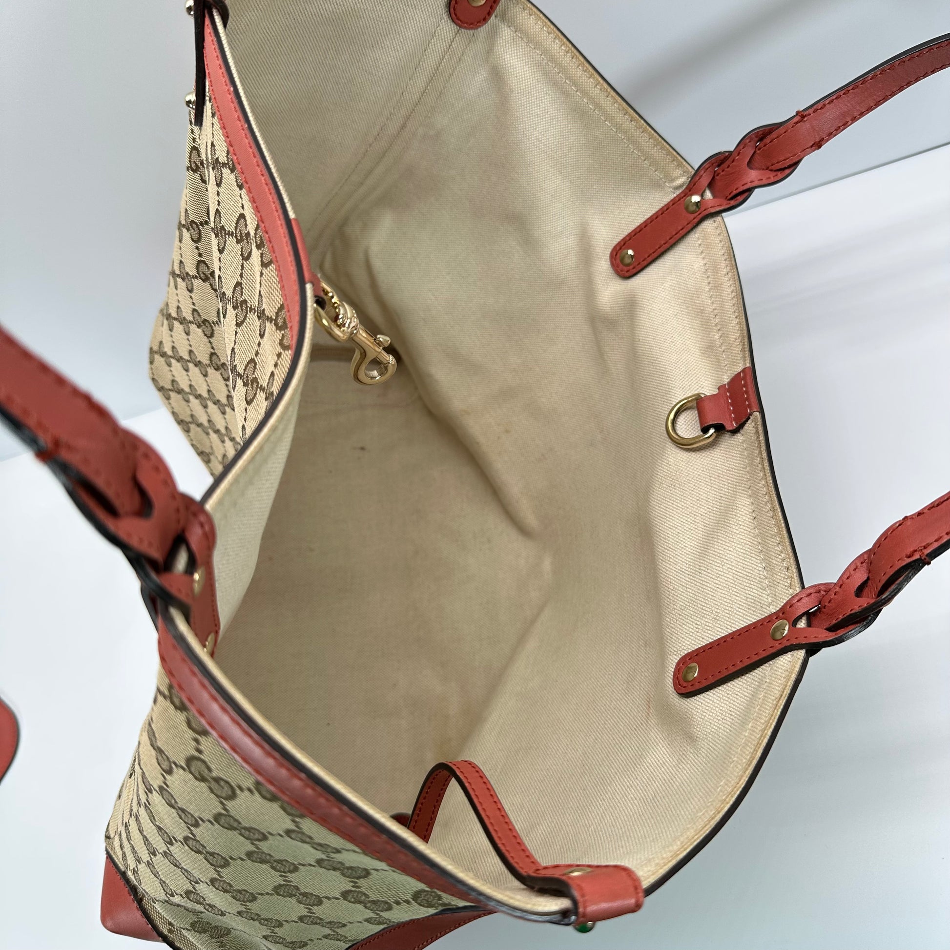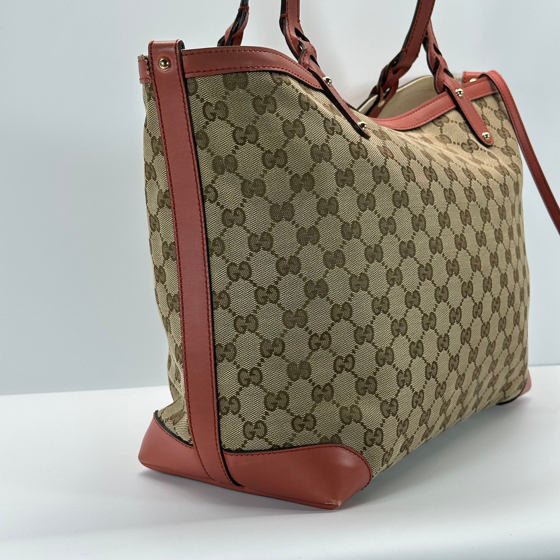 Add a bold pop of color to your everyday routine with this Gucci Canvas Medium Craft Tote, featuring coral-colored leather straps and corner accents that set it apart from the rest. Measuring approximately 17” x 10”, this tote is the perfect size for daily use, school, or travel—roomy without being bulky.