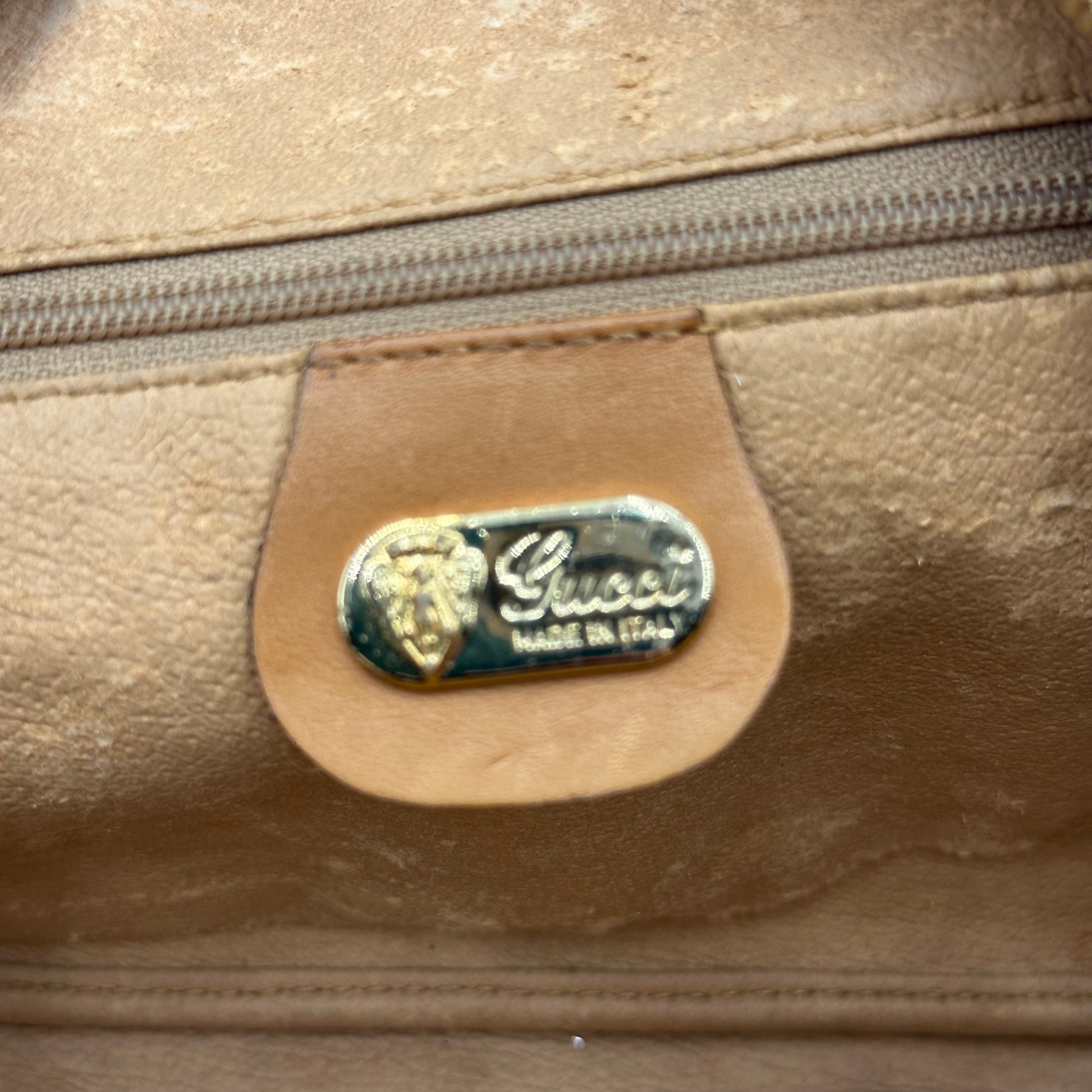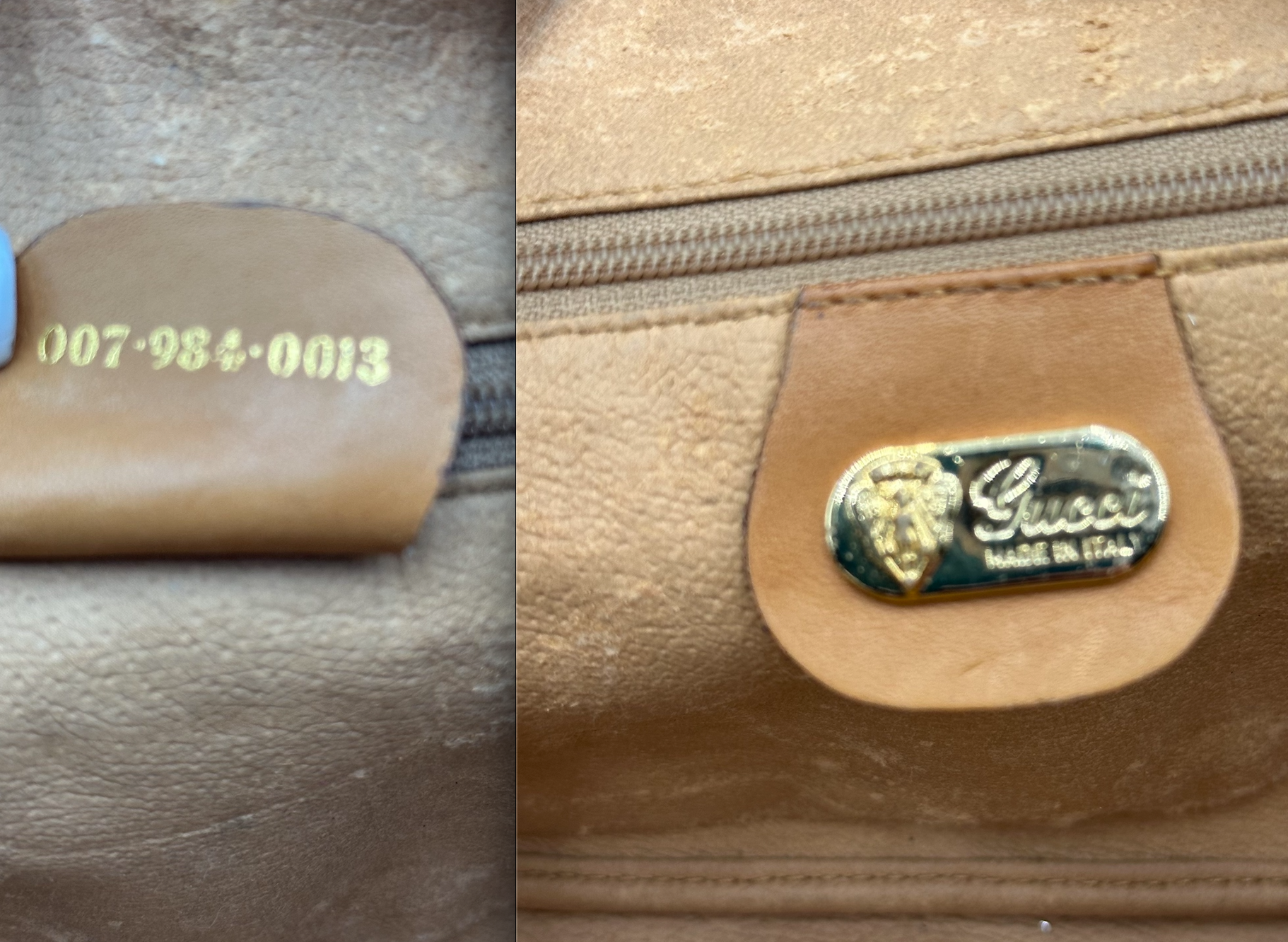 The interior shows normal signs of use, with pen marks and some peeling in the pocket but no stickiness. The vachetta and piping light rubbing, but the canvas remains in great shape with no cracks or major wear. Two small marks on the back. The original leather side chaps were torn and have been replaced with two gold-tone rings to securely attach a non branded guitar strap. Serial code: 0079840013.