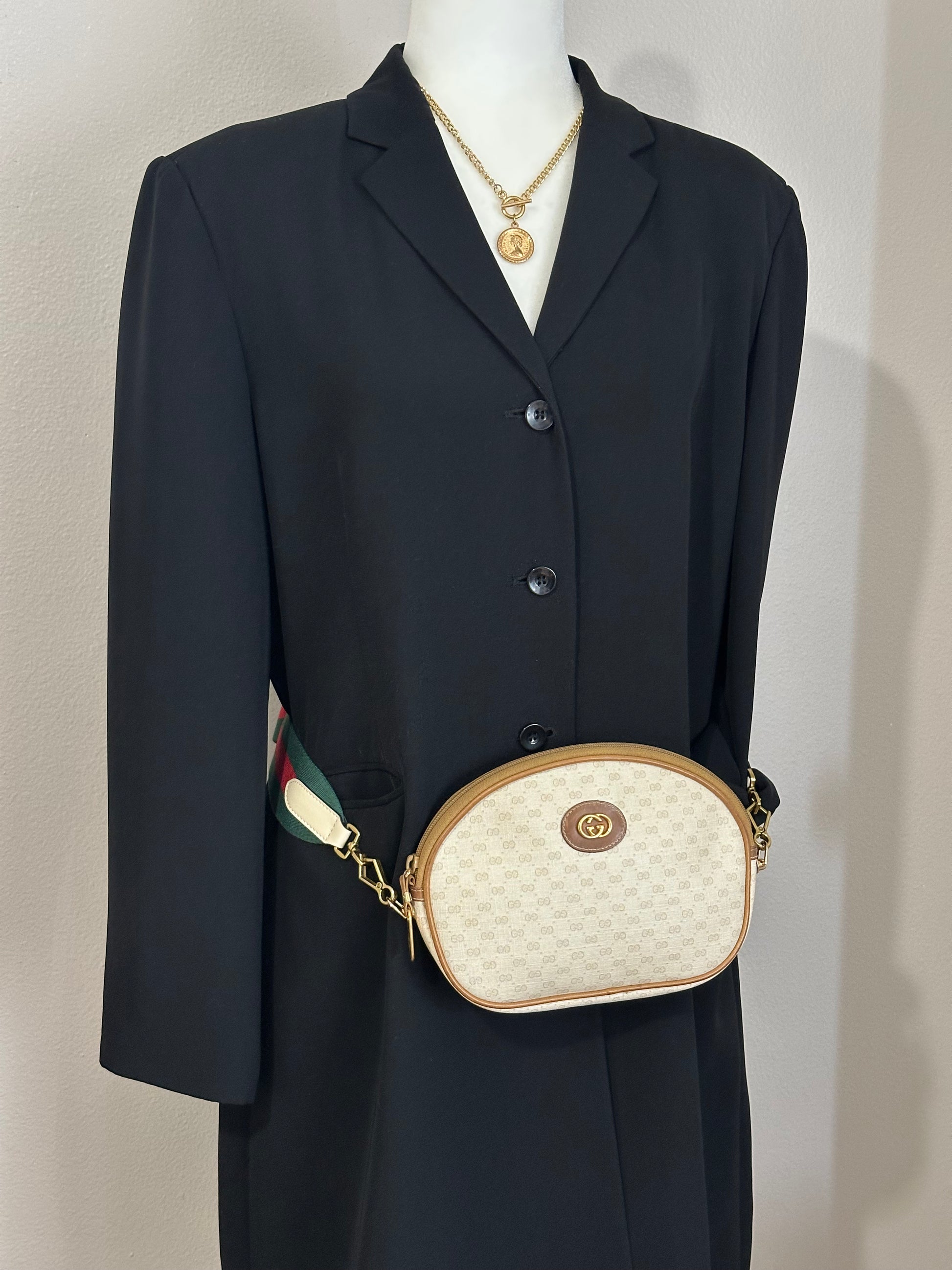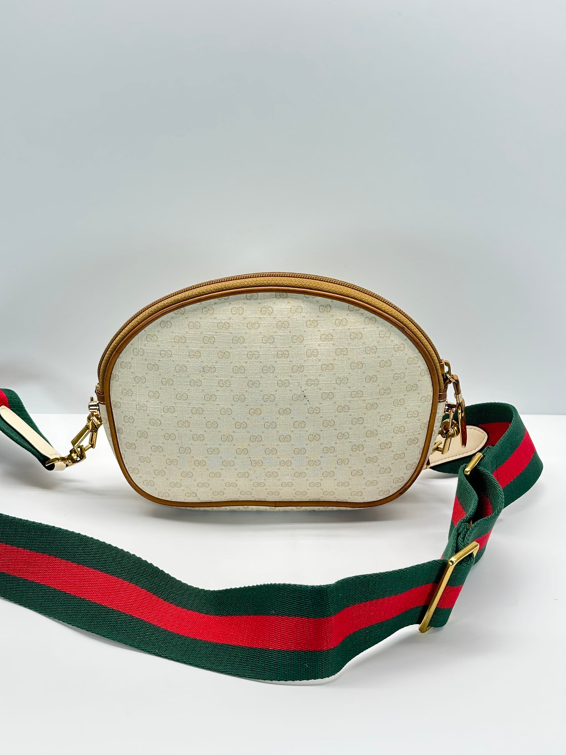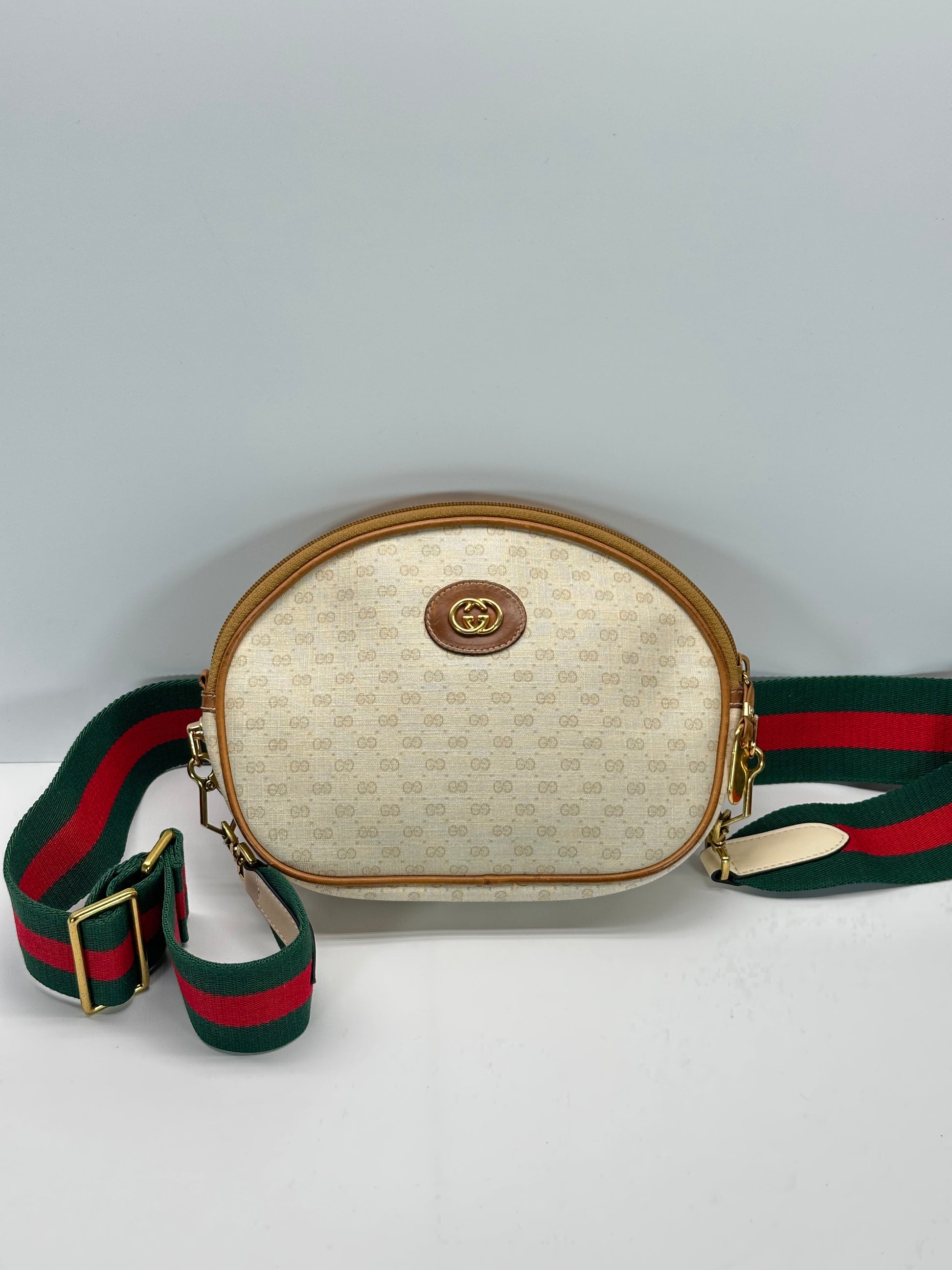 This GUCCI White Micro GG Canvas Crossbody is a timeless vintage piece, crafted from iconic monogram canvas with vachetta leather trim. Released in the early 1990s, it features one zipper top compartment and measures approximately 8.5" L x 7" H x 2" D. Originally retailed for around $860 USD.