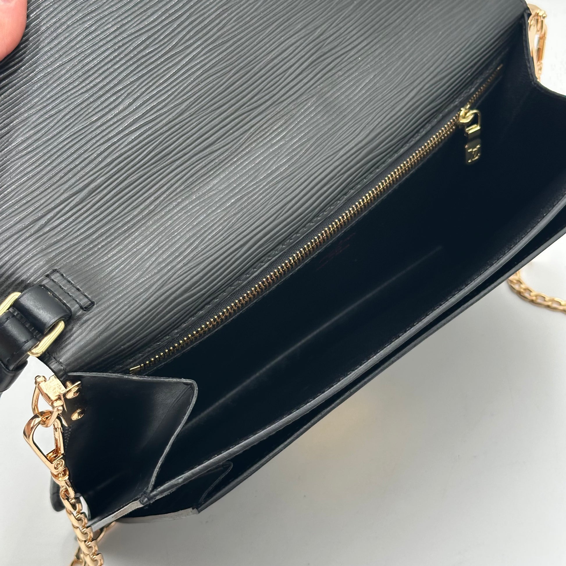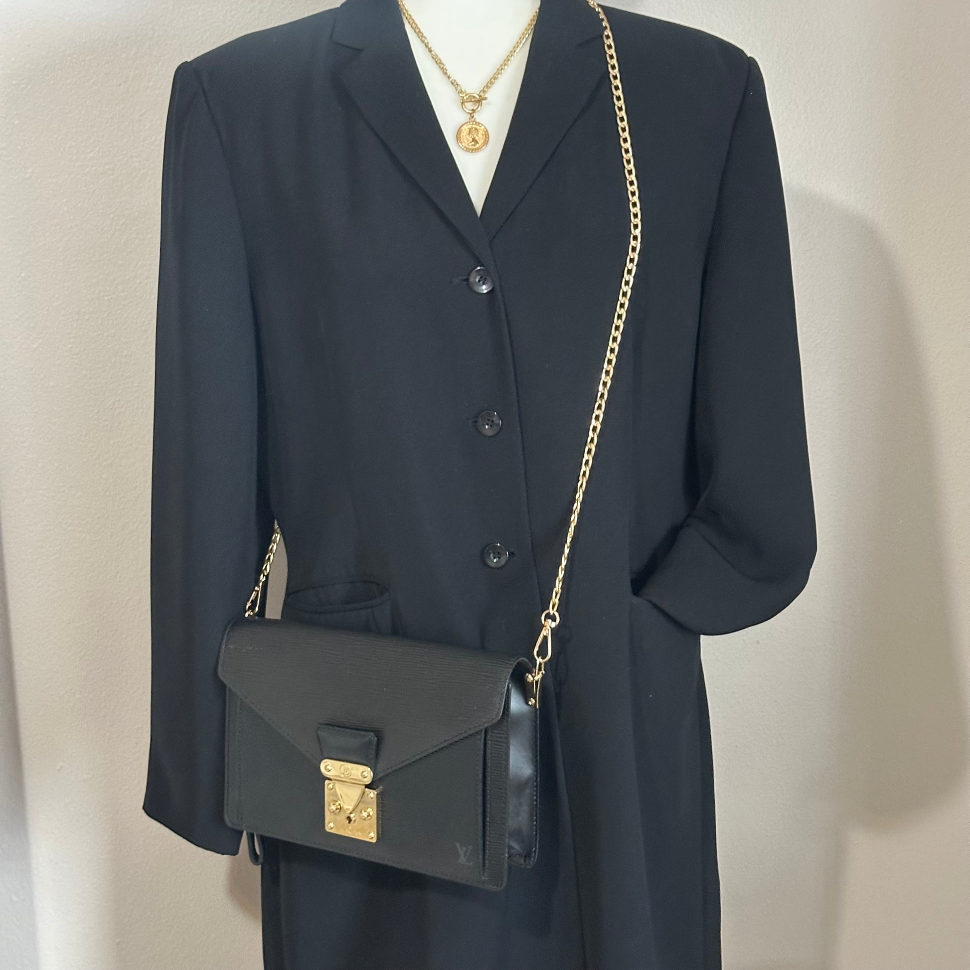 This authentic Louis Vuitton Epi Dragonne clutch in sleek black is a structured vintage gem that easily transitions from wristlet to crossbody. Crafted in durable epi leather showing a fresh black. It shows no cracks or tears—only light surface scratches and very minimal rubbing on the corners, nothing distracting. It measures approximately 10.5 x 7.5 inches, making it the perfect size to carry your essentials in style.