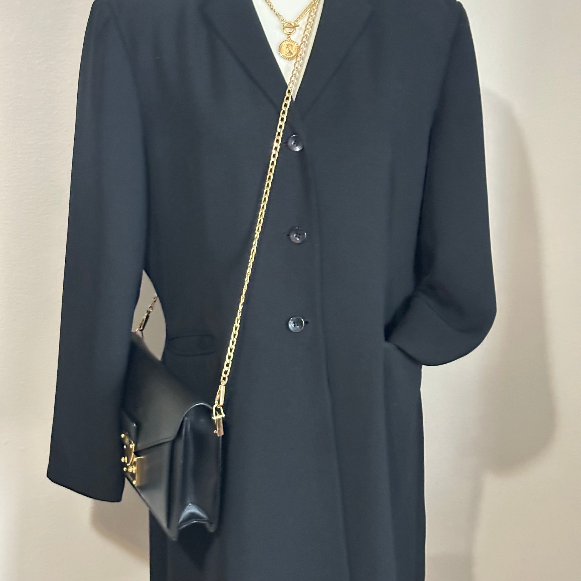 The interior is a beautiful beige color and is clean with no peeling or stickiness in the pockets. The front clip and zipper both function smoothly. The original key for the lock is not included, but the lock itself remains a charming detail. Two discreet gold rings have been added to the sides so it can be worn as a crossbody. A non branded chain is included, or you can request a thicker strap free of charge.