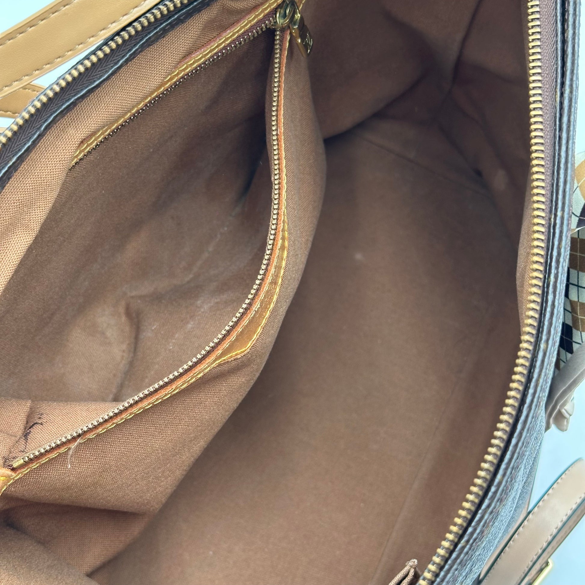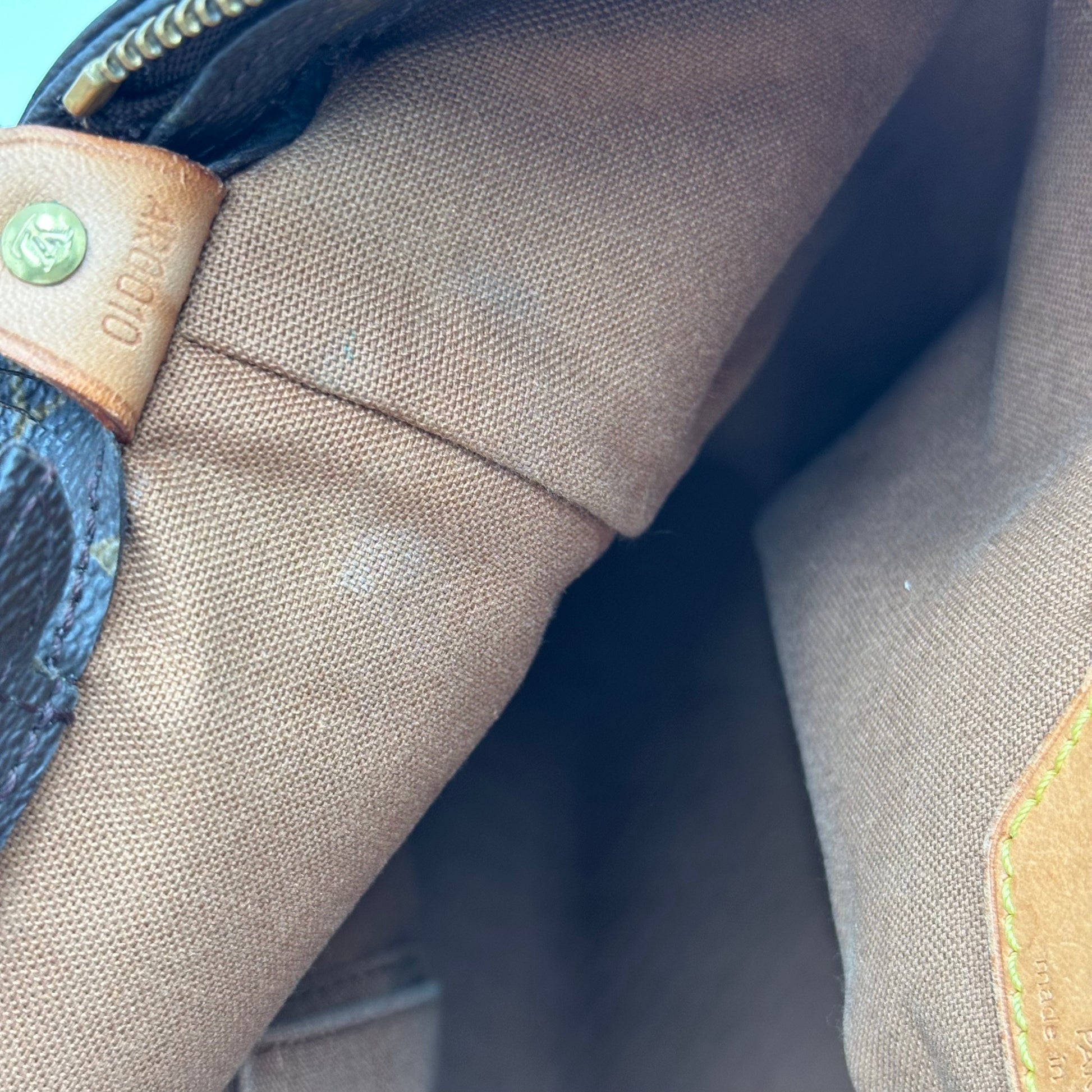 The interior is clean, with no stains or tears, and both the slip pocket and D-ring area are pristine. The original vachetta leather shoulder straps were torn and have been replaced with high-quality, non-branded leather straps for durability and continued functionality. Each handle now features a ring to attach the included non-branded shoulder or crossbody strap, giving you multiple carrying options. The zippers function smoothly, and the bag carries the date code AR0010, confirming its French manufacture in the first week of 2000. For a unique, refreshed aesthetic, the bottom vachetta leather base has been professionally painted and sealed in black, blending beautifully with the classic monogram canvas. This is a stylish and functional piece with character, ready for its next chapter.