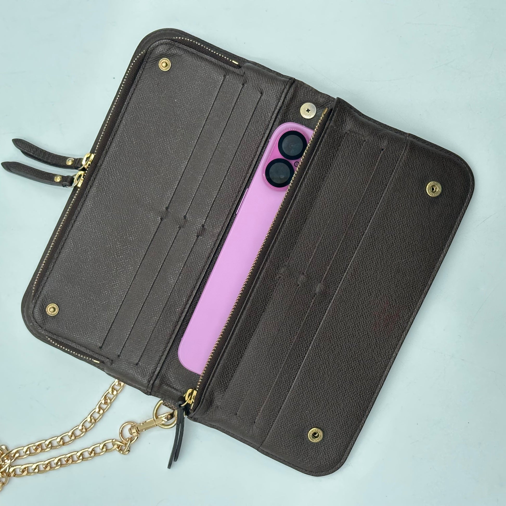 This Louis Vuitton Damier Ebene Insolite Wallet is a rare gem that combines classic elegance with everyday functionality—and just the right amount of flair. Released around 2009, this beautifully designed piece features LV’s signature Damier Ebene canvas in rich chocolate tones, paired with a pop of Rose Ballerine pink on the interior that’s as fun as it is feminine. Measuring approximately 8.3 inches in length and 4.3 inches in height, it’s long enough to fit a large iPhone Pro Max, all your cards, cash, receipts, and more—without sacrificing style.