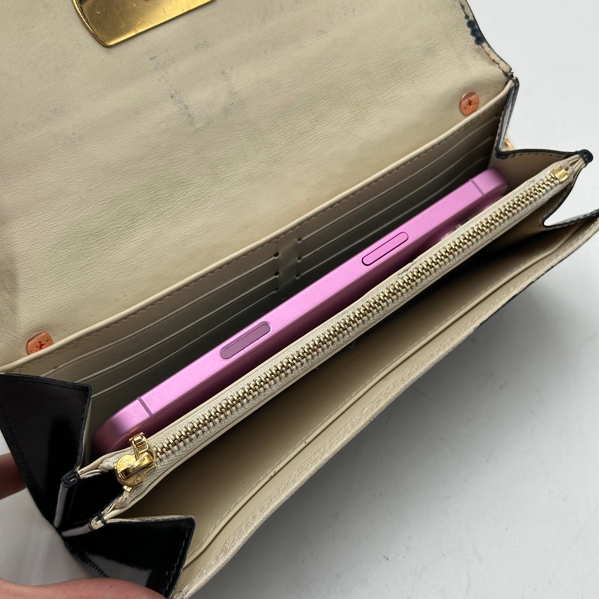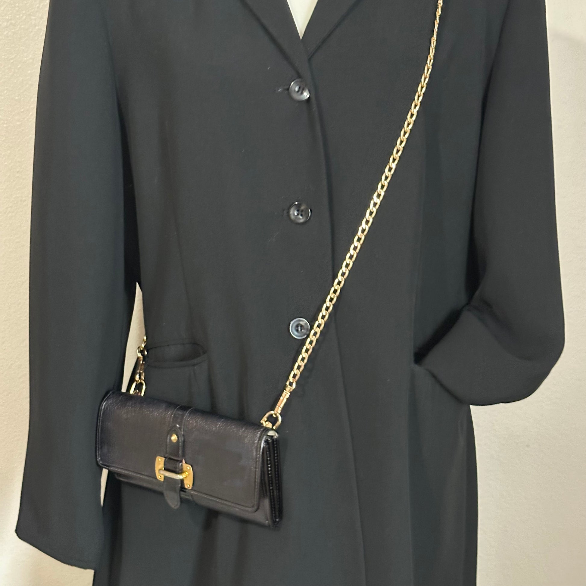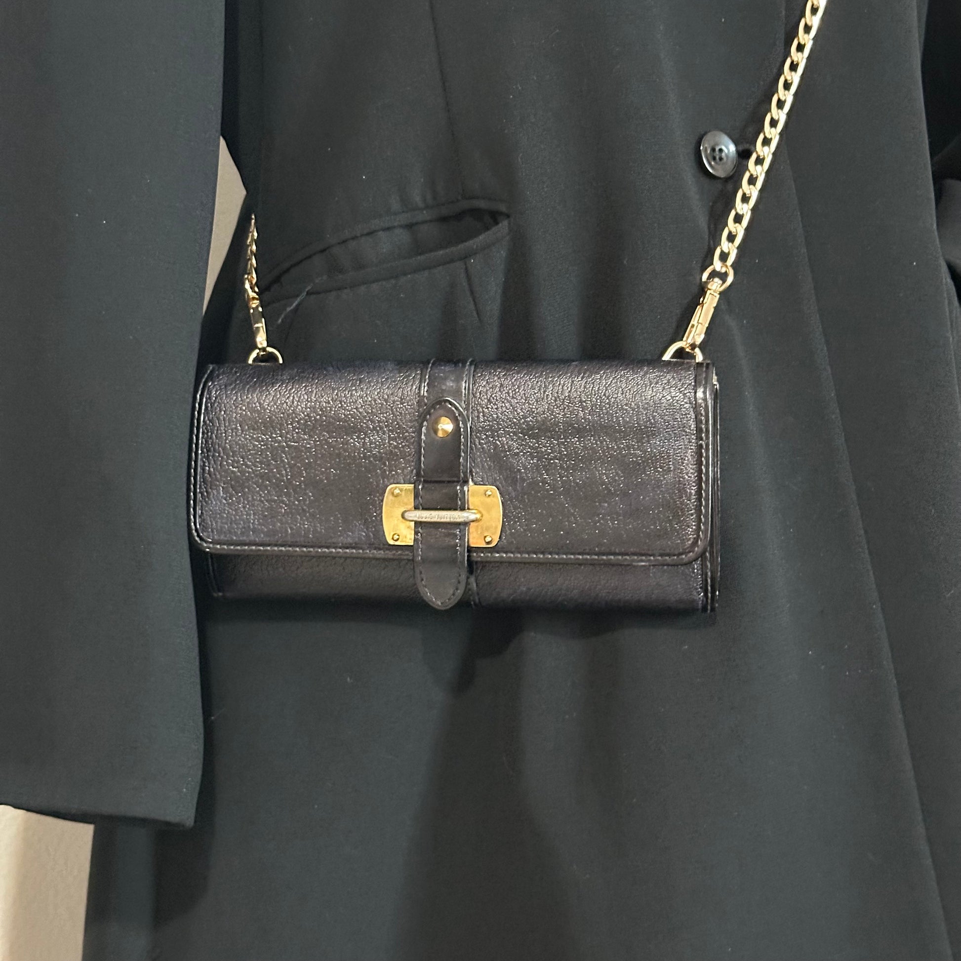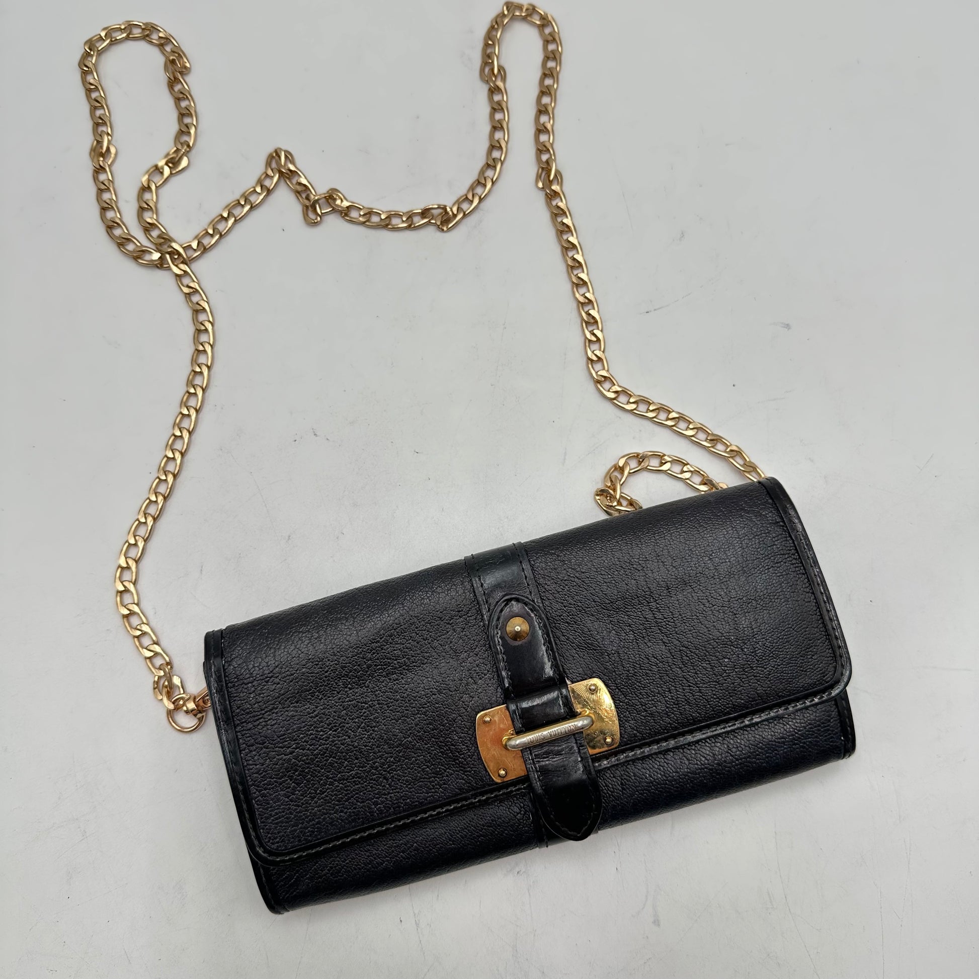 Two gold rings have been installed on the back so you can wear it as a stylish crossbody, and a non-branded gold chain can be included upon request. The interior shows normal use with no major damage or tears, and the corners and edges inside show light rubbing typical of gentle wear. Both the zipper and front buckle work smoothly. Whether you’re dressing up or running out the door, this wallet is the perfect mix of practicality and luxury.