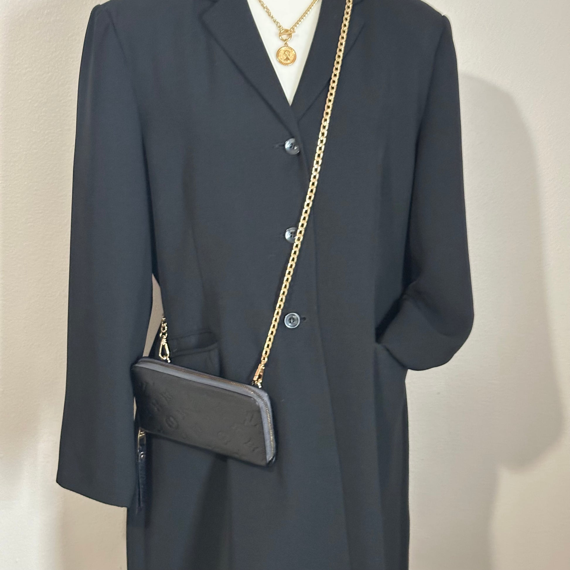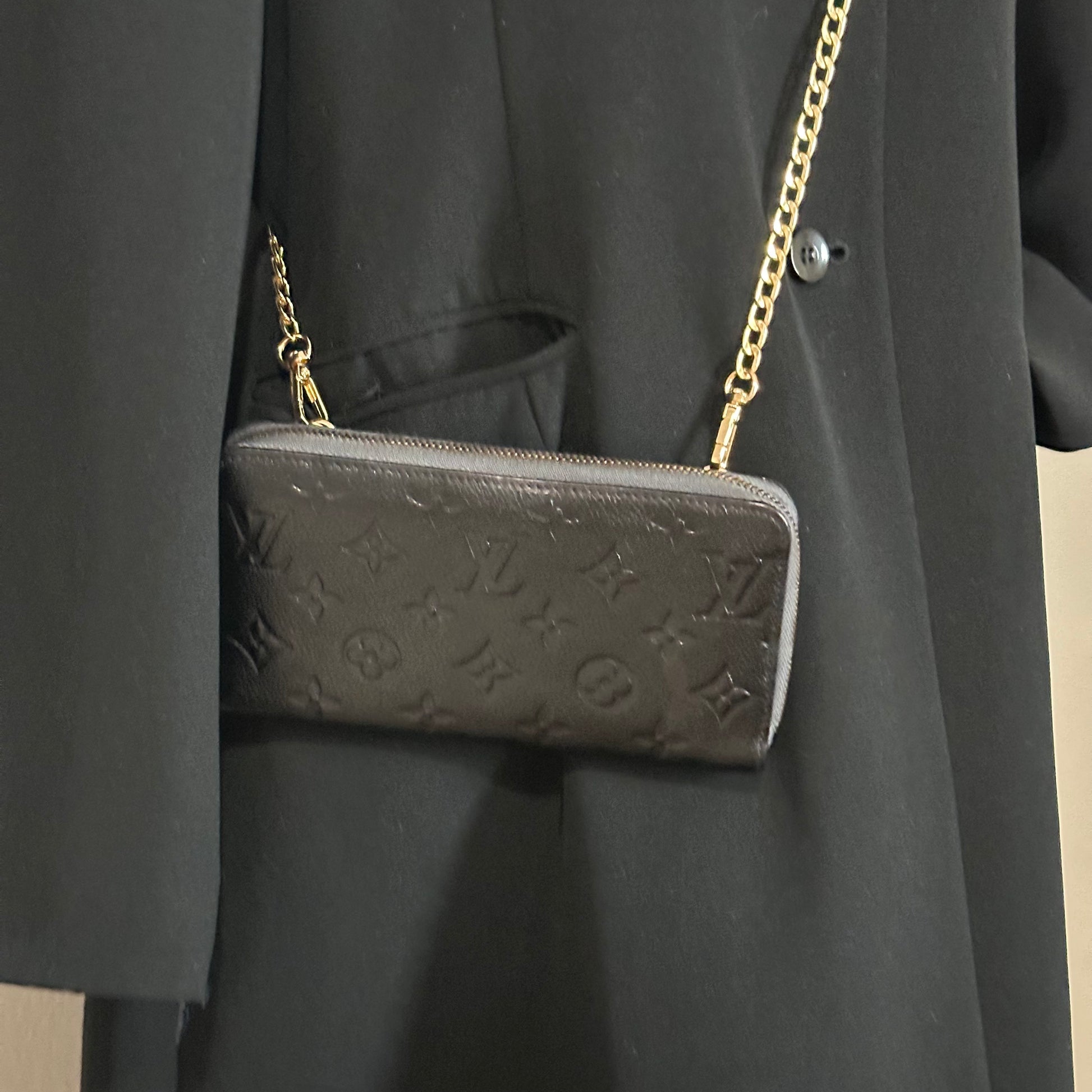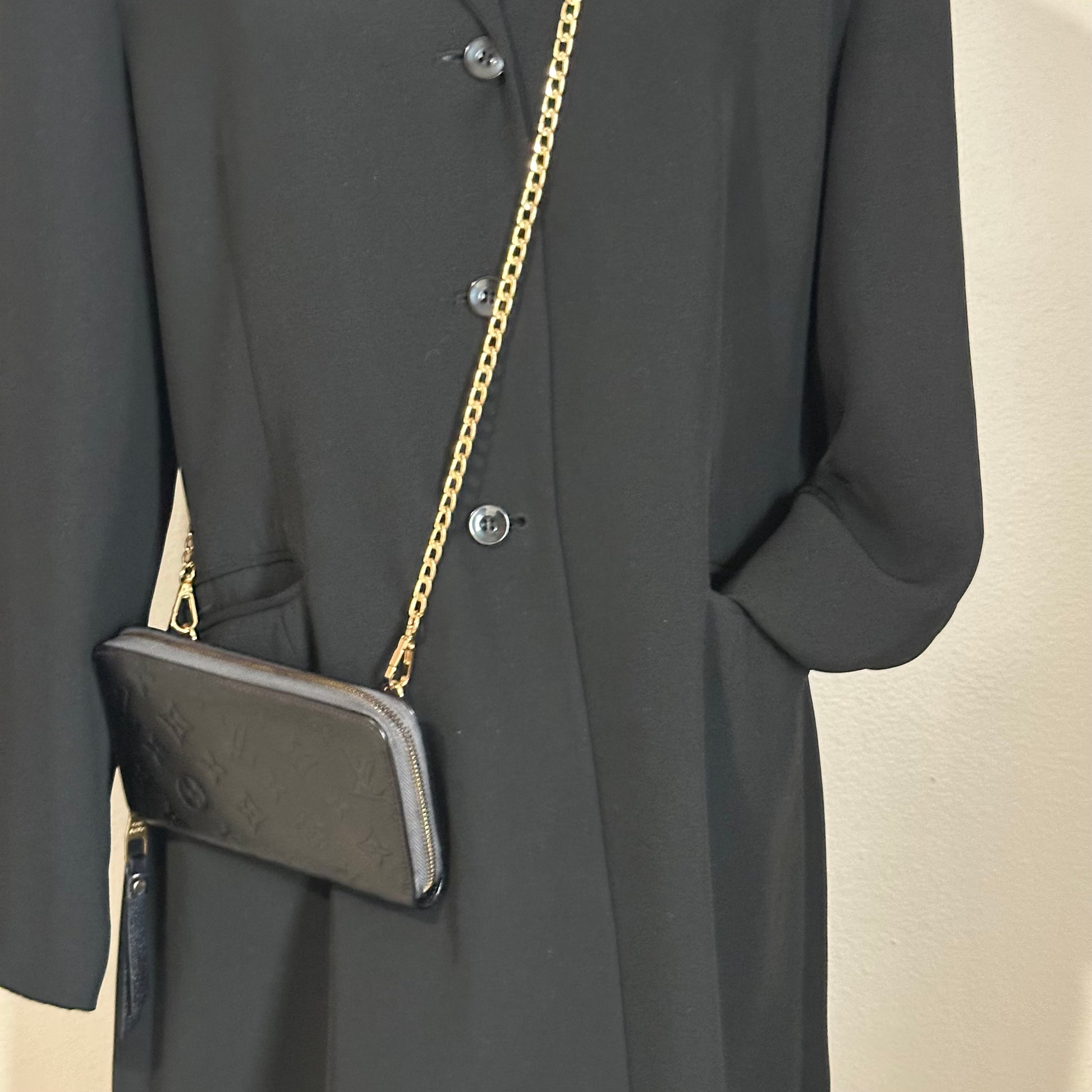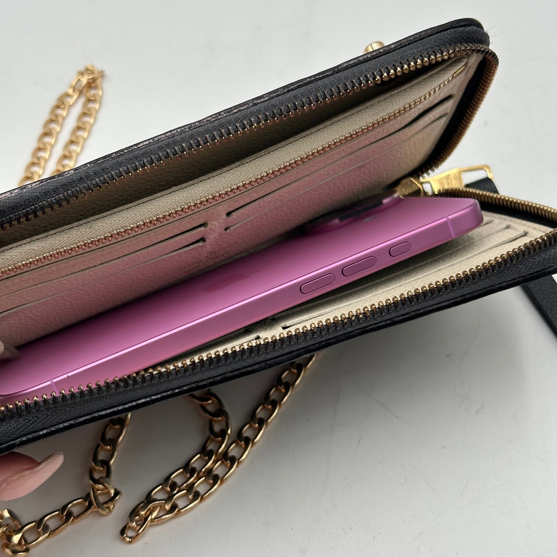 This particular piece has been professionally customized into a crossbody wallet with the addition of two sturdy rings on the back and a non-branded adjustable strap for hands-free convenience. The exterior leather has been professionally re-dyed black, restoring its rich tone and giving it a like-new appearance. Inside, there are minor signs of use such as rubbing and small spots, but there is no peeling or stickiness in the pockets. All zippers are fully functional and glide smoothly.