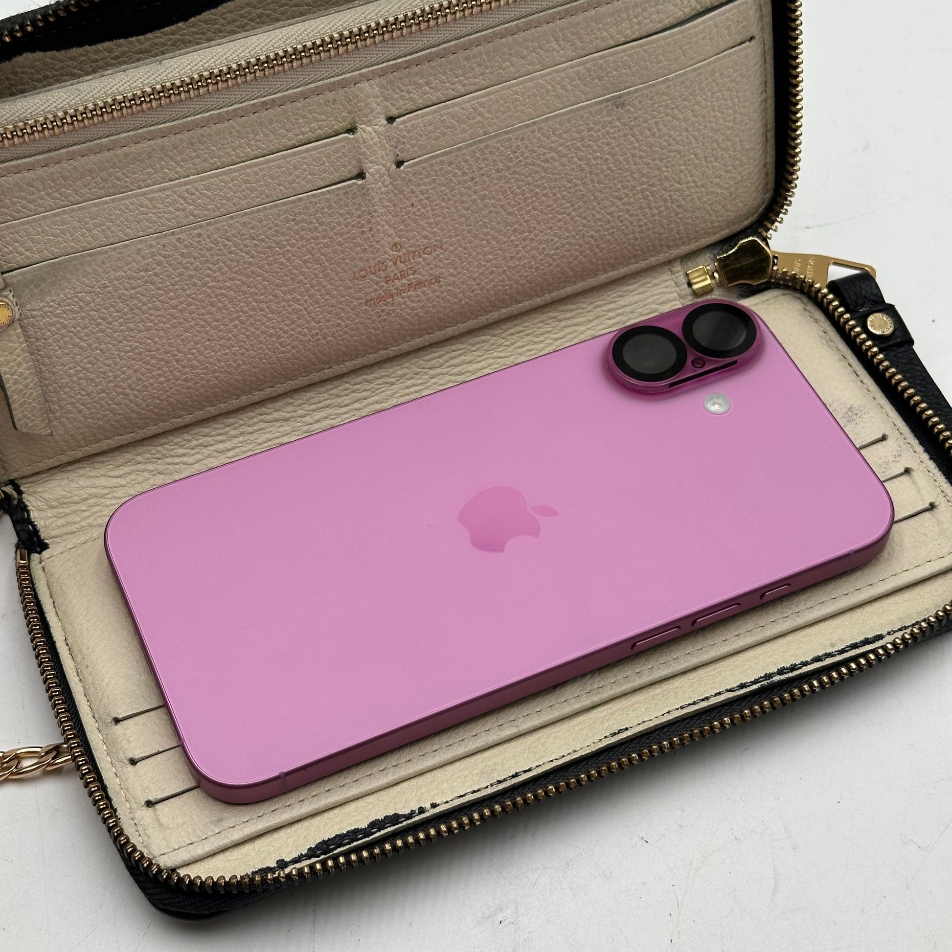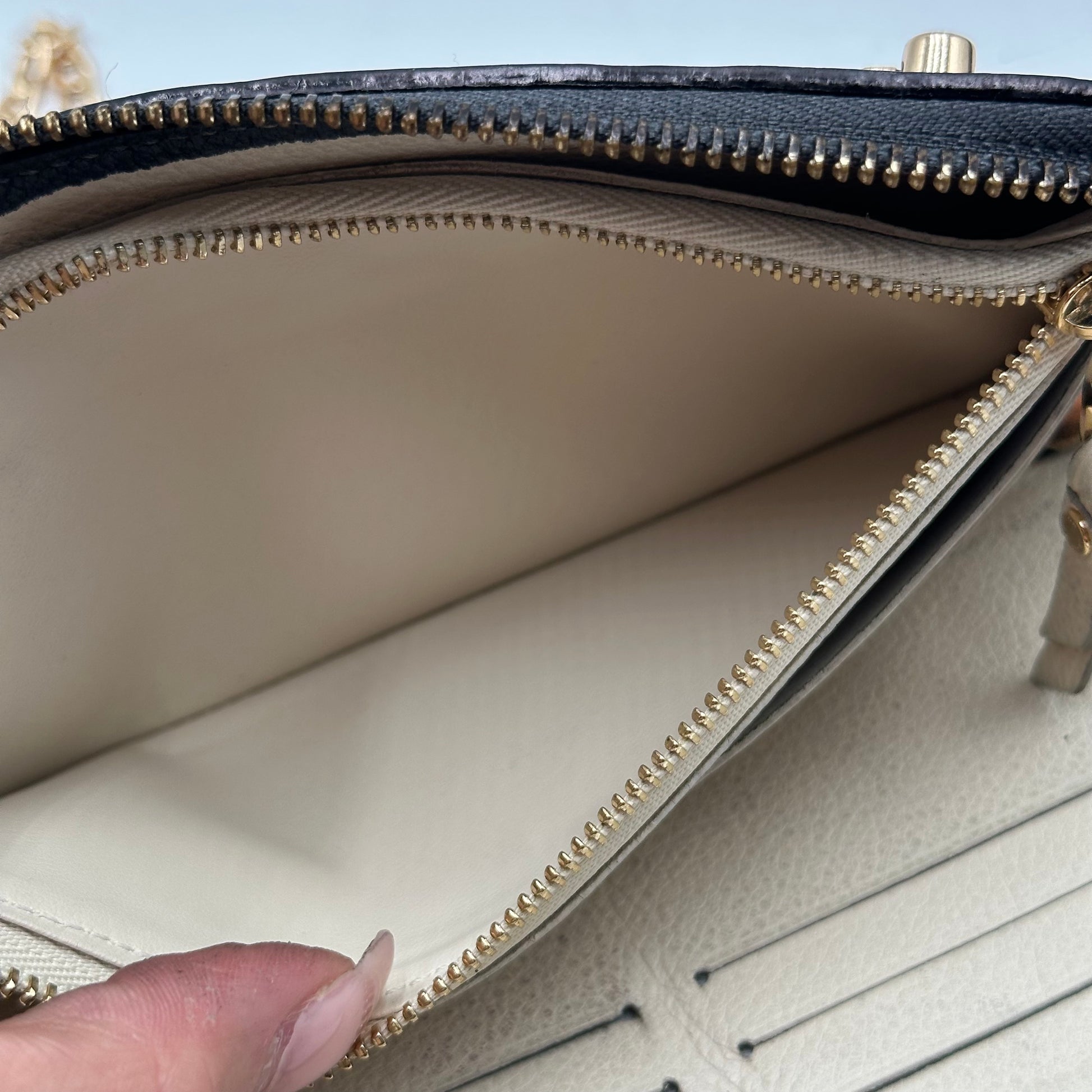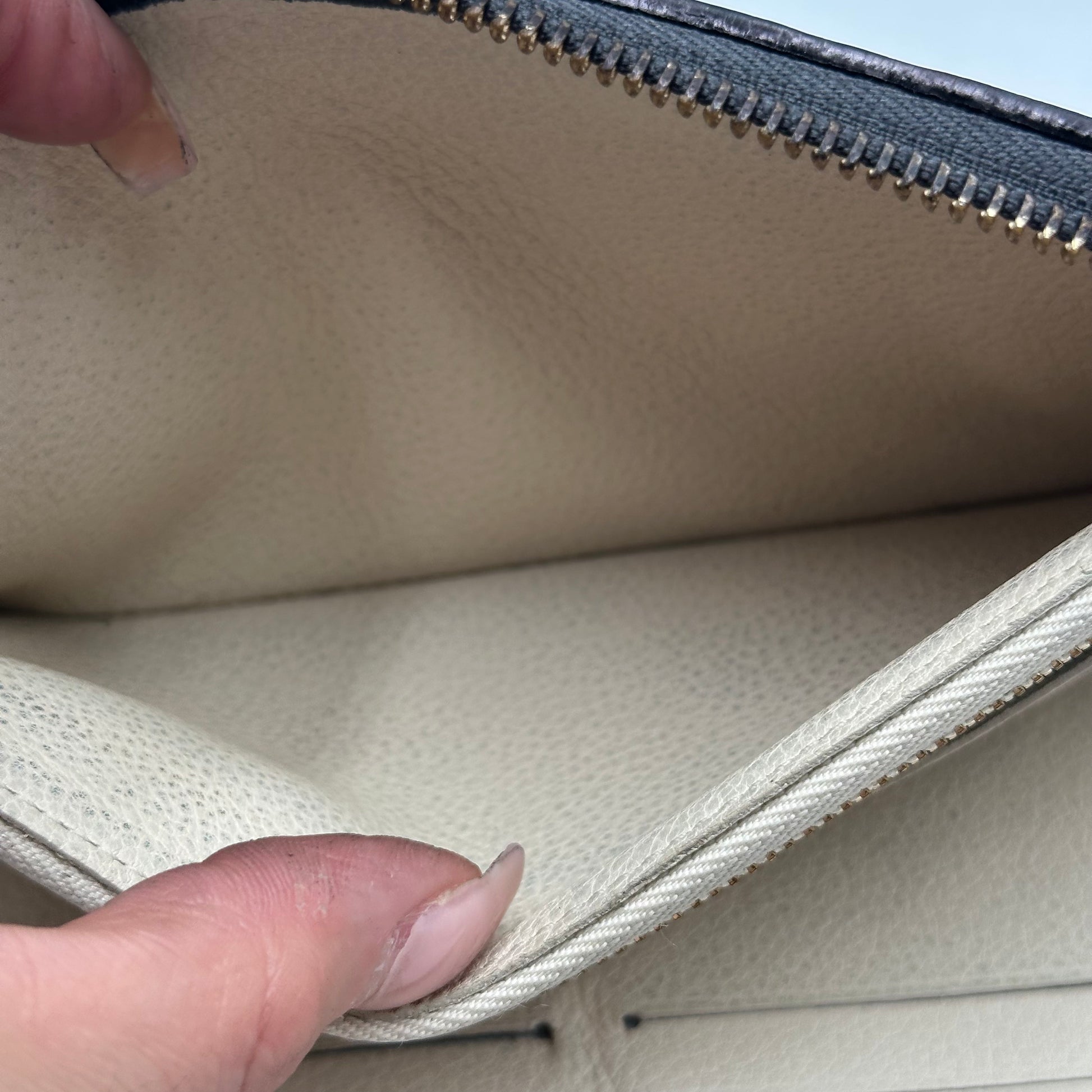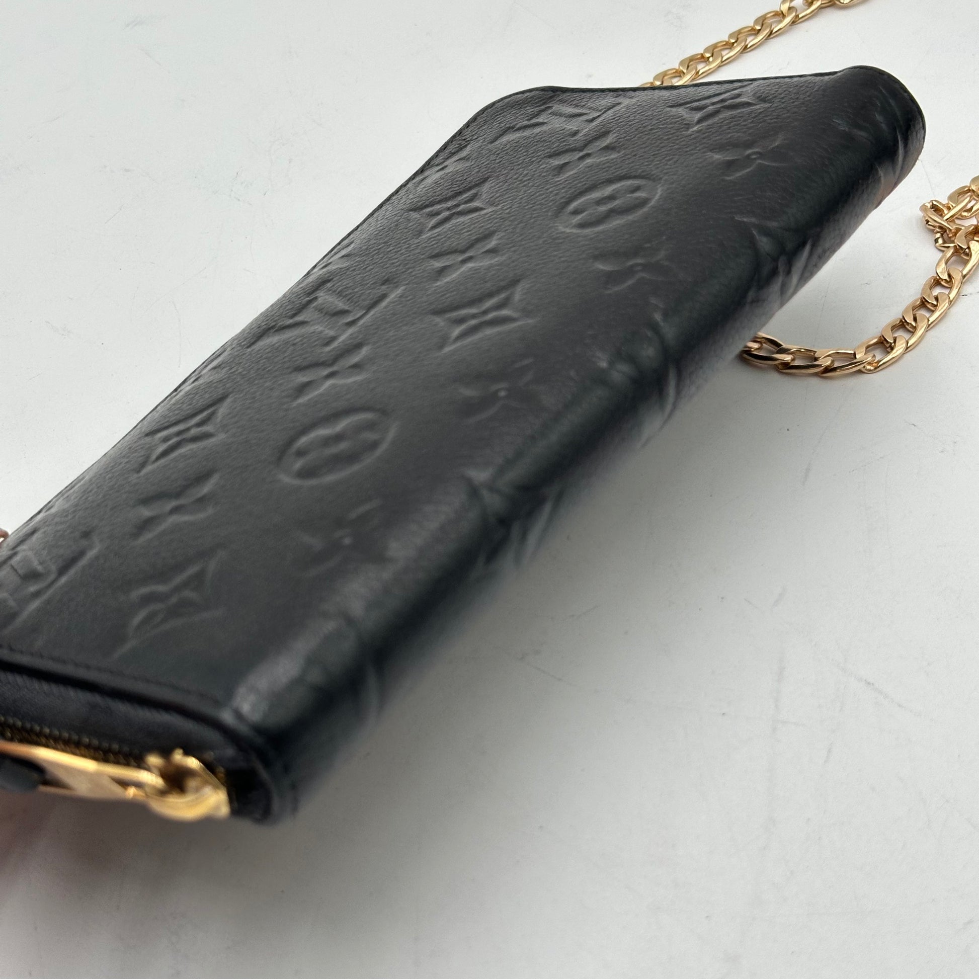 This particular piece has been professionally customized into a crossbody wallet with the addition of two sturdy rings on the back and a non-branded adjustable strap for hands-free convenience. The exterior leather has been professionally re-dyed black, restoring its rich tone and giving it a like-new appearance. Inside, there are minor signs of use such as rubbing and small spots, but there is no peeling or stickiness in the pockets. All zippers are fully functional and glide smoothly.