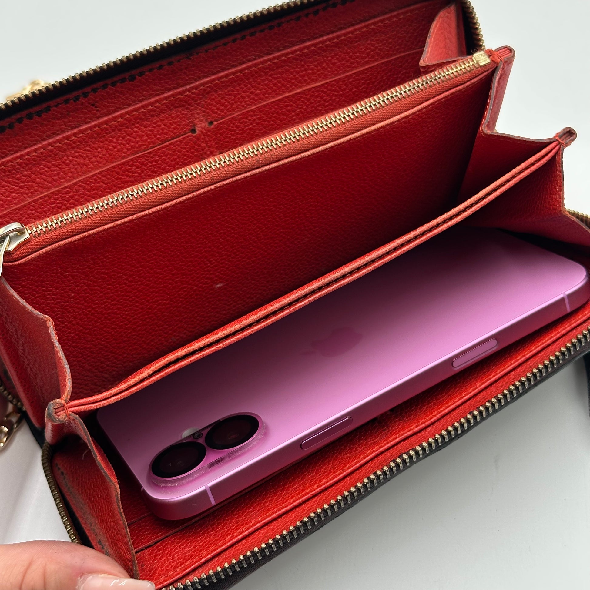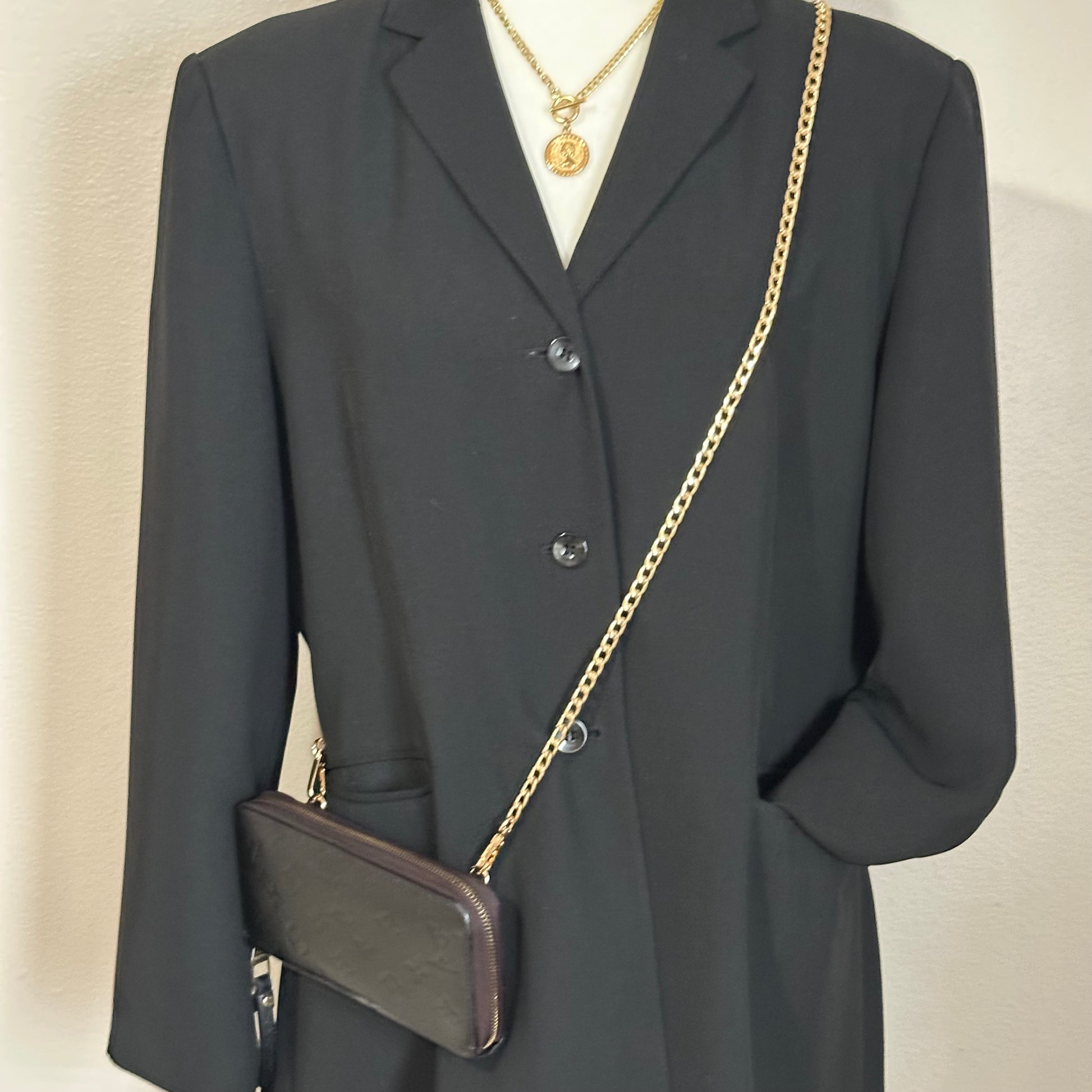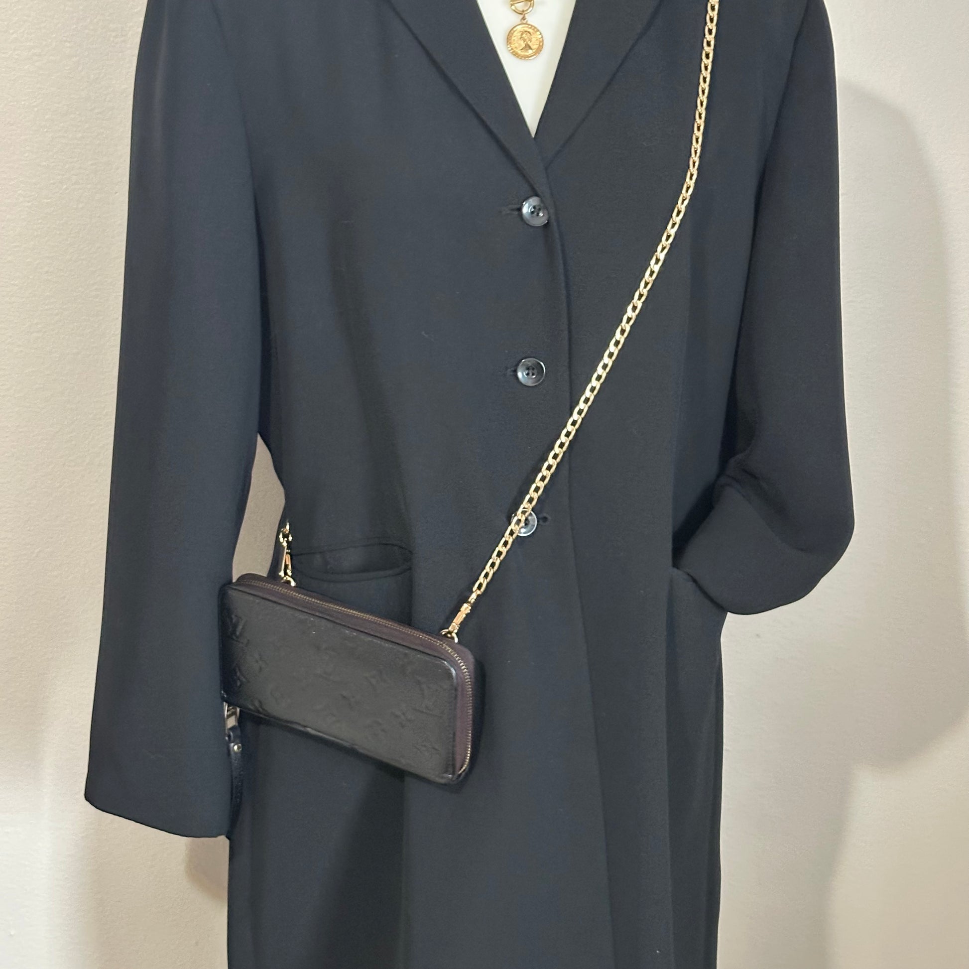 This particular piece has been professionally customized into a crossbody wallet with the addition of two sturdy rings on the back and a non-branded adjustable strap for hands-free convenience. The exterior leather has been professionally re-dyed black, restoring its rich tone and giving it a like-new appearance. Inside, there are minor signs of use such as rubbing and small spots, but there is no peeling or stickiness in the pockets. All zippers are fully functional and glide smoothly.
