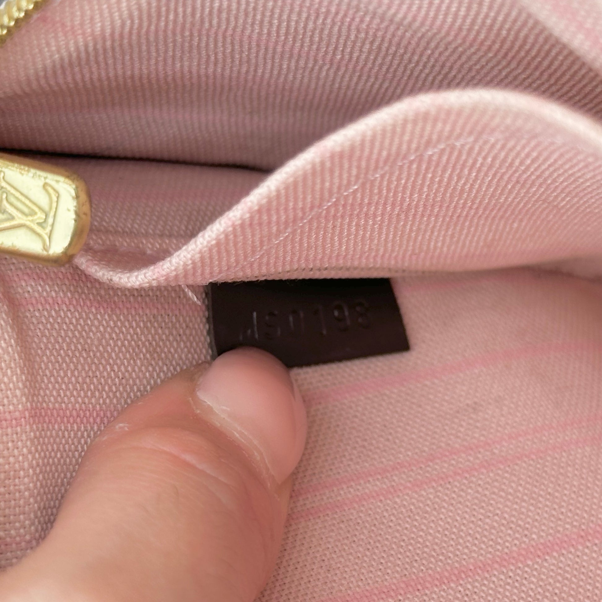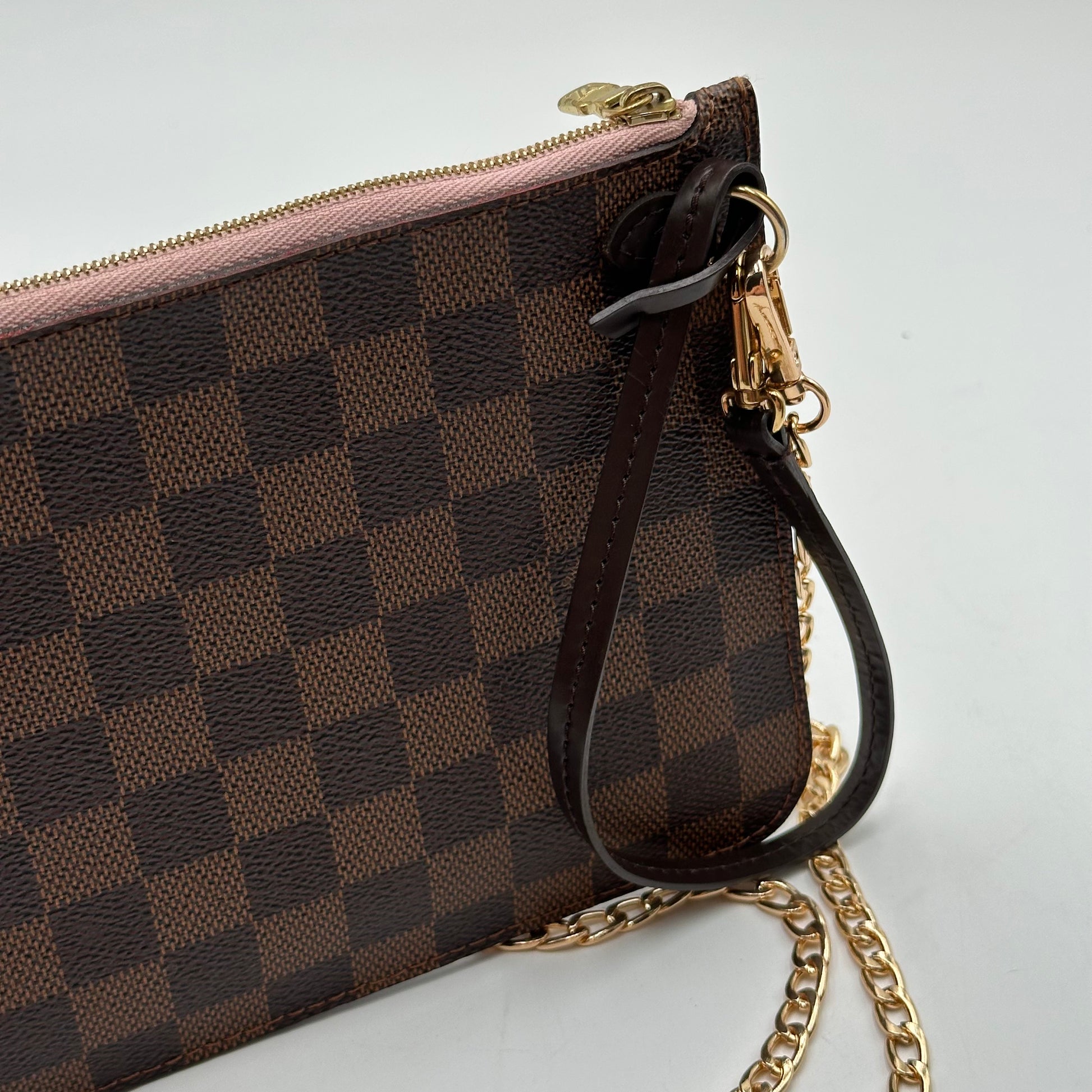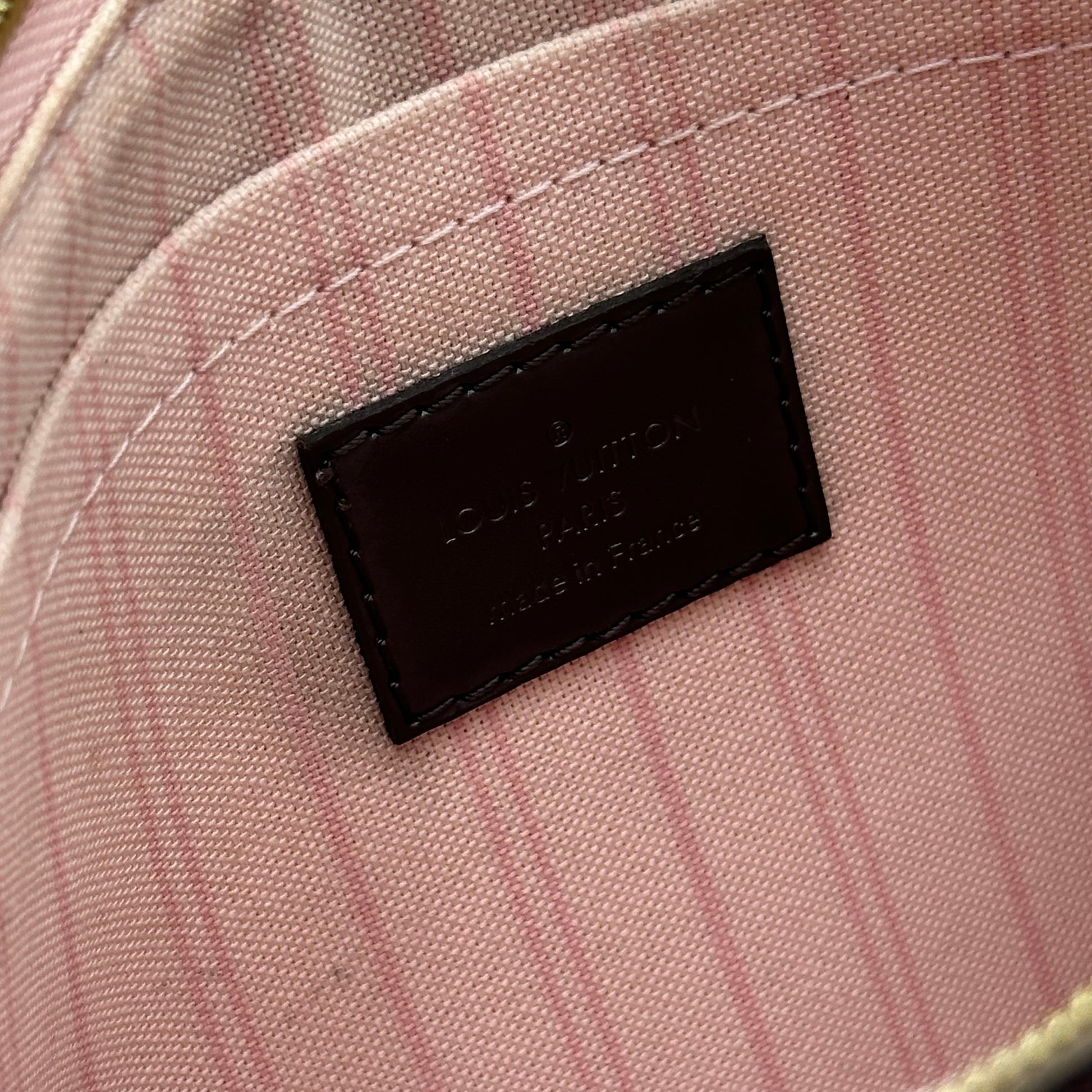 Authentic Louis Vuitton 2018 Damier Ebene Rose Ballerine Neverfull MM Wristlet Crossbody
