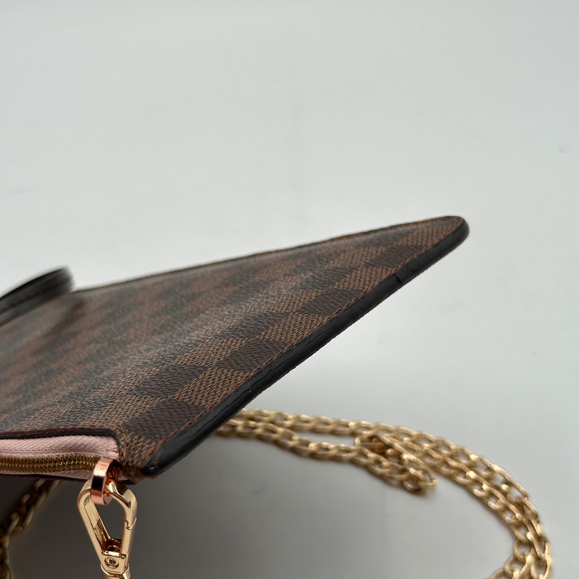 This authentic Louis Vuitton Damier Ebene Neverfull MM wristlet is a stylish and versatile piece that works beautifully on its own. Originally included with the Neverfull tote, this wristlet features the elegant Rose Ballerine pink interior and vibrant brown checkered canvas—no cracks, tears, or peeling anywhere on the exterior. The canvas is rich and smooth, making this piece both eye-catching and reliable for everyday or occasional use. Date code of AS0198, produced in the 9th week of 2018.