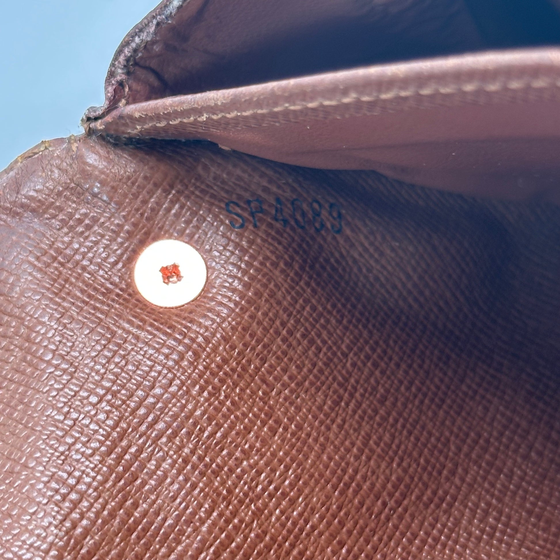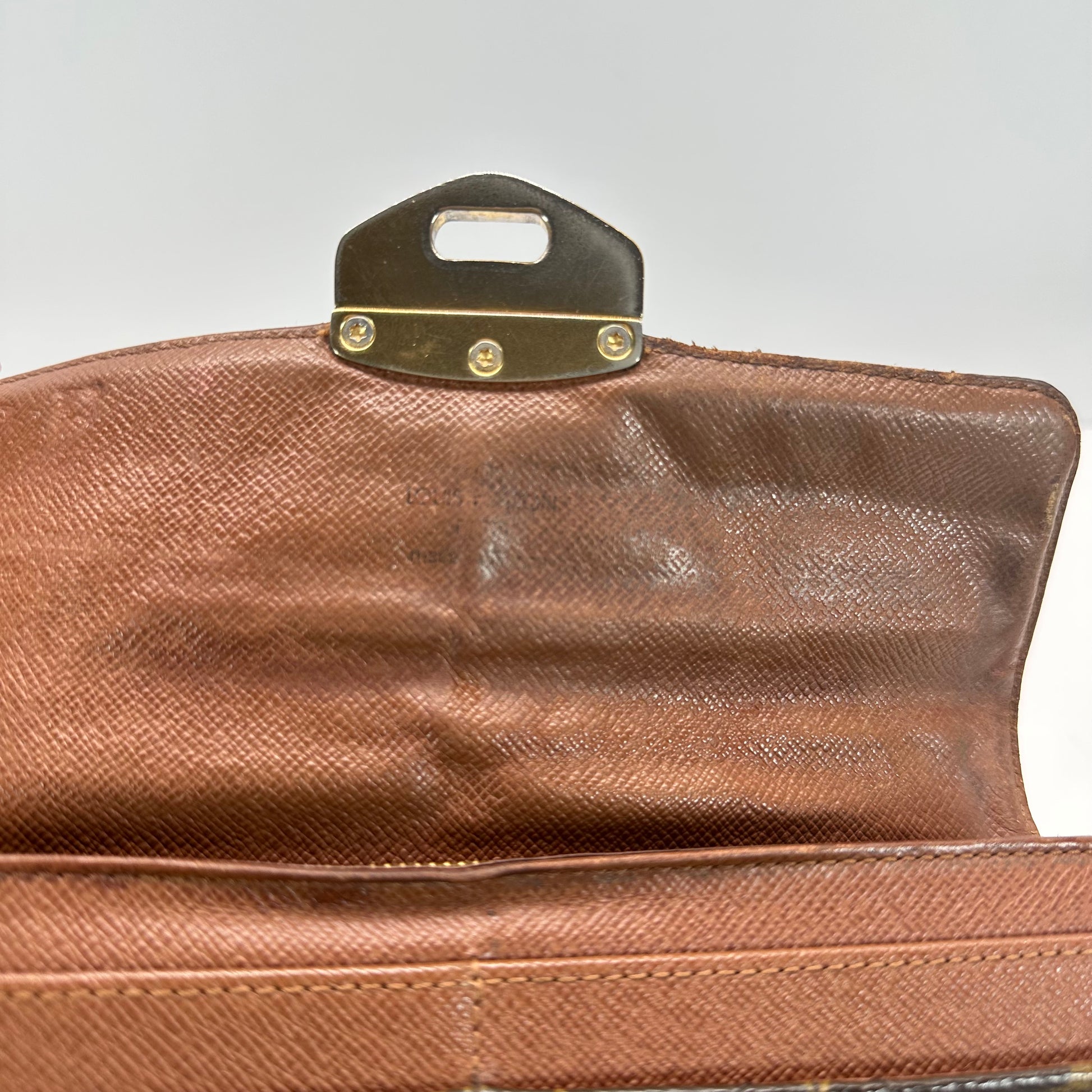 The monogram canvas is in beautiful condition with no tears, and the corners show very light wear. The vachetta leather trim and edges reflect its vintage age with natural patina and signs of use that add to its character. Two gold-tone rings have been added to the back, allowing it to be worn as a crossbody with a non-branded gold chain—included for extra flair.