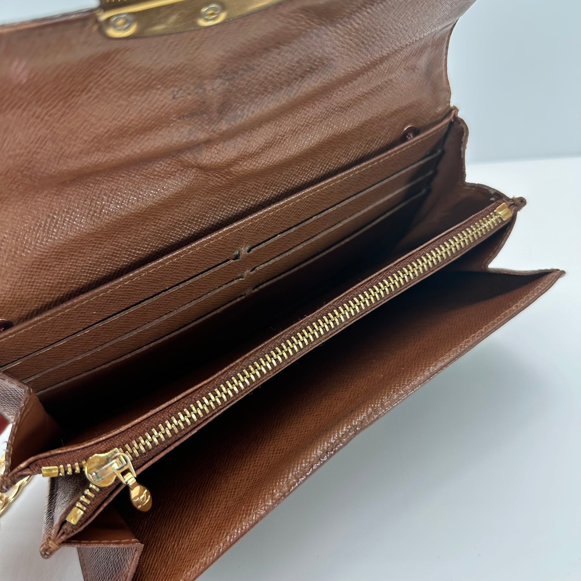 Inside, the interior is well-kept with no peeling or tears, just gentle wear consistent with its age. It features multiple compartments, a zip pocket, and fits a large iPhone Pro Max with ease.