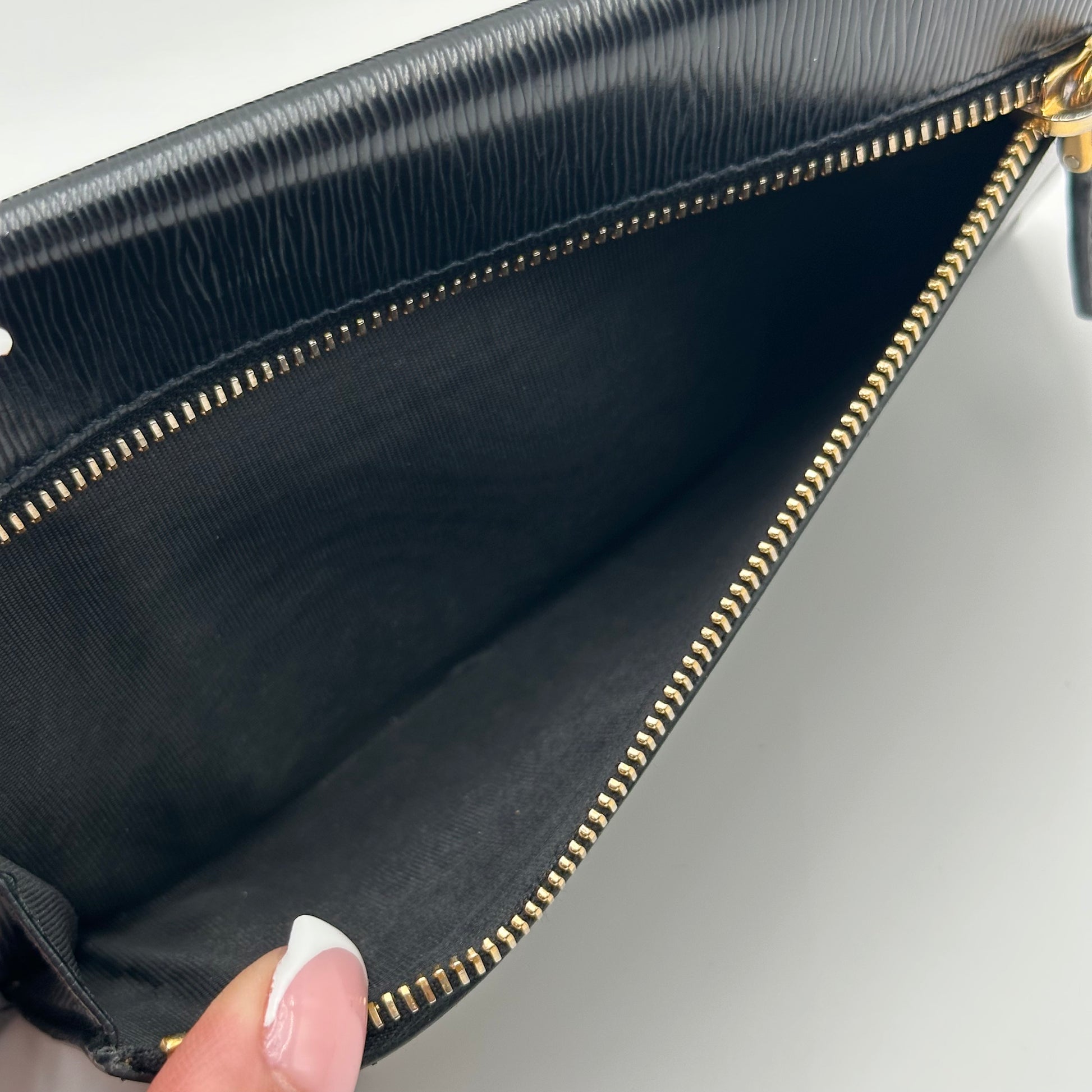 This Prada Black Saffiano Envelope Wallet is the definition of timeless sophistication with a twist of versatility. Crafted in Prada’s iconic Saffiano leather—known for its durability, texture, and resistance to wear—this sleek envelope-style wallet adds instant polish to any look. Measuring approximately 7.5 inches in length and 5 inches in height, it’s surprisingly roomy and fits a large iPhone Pro Max, along with your cash, cards, and daily essentials.